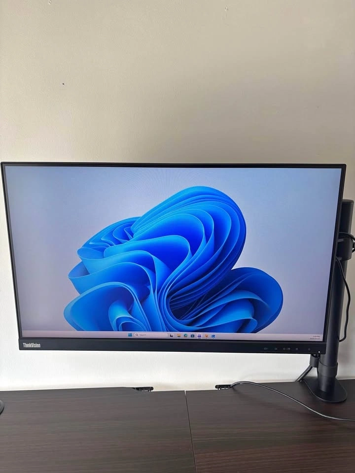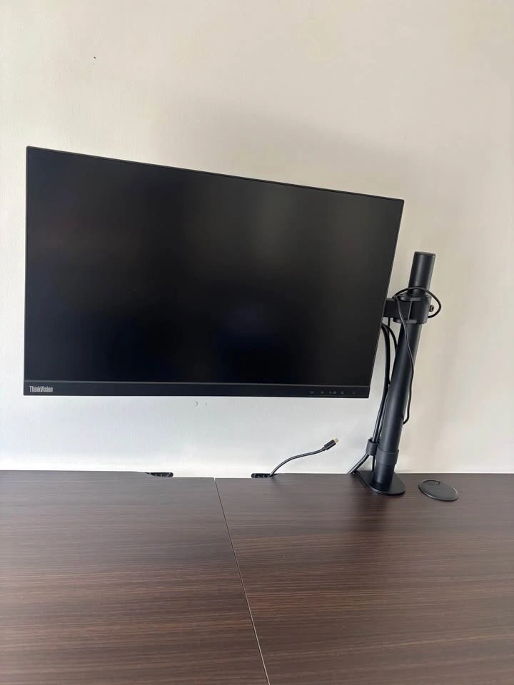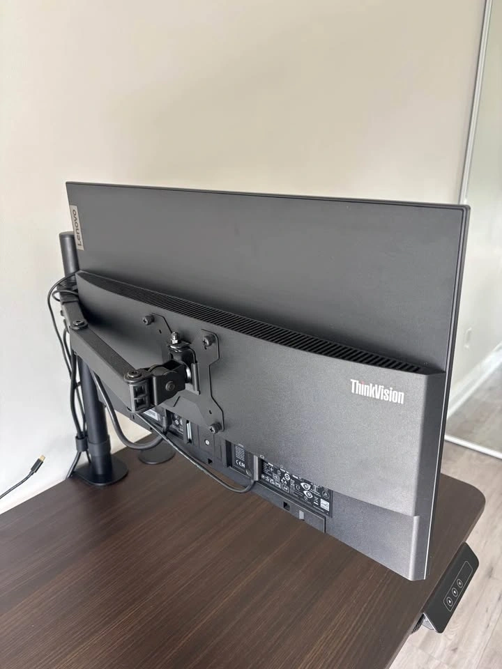 Clean Lenovo ThinkVision S24e-20 monitor with a sleek black finish. Comes with a desk mount for easy setup. Great for a home office or gaming station.