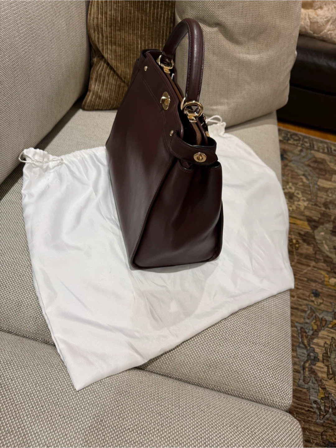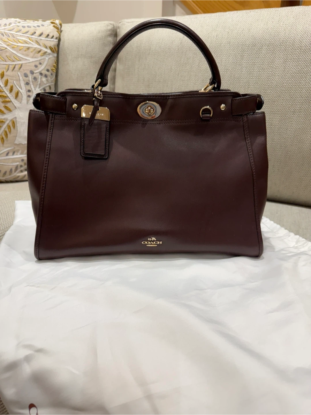 Gorgeous brown leather handbag. Top handle and detachable shoulder strap. Gold-toned hardware. Includes Coach dust bag.