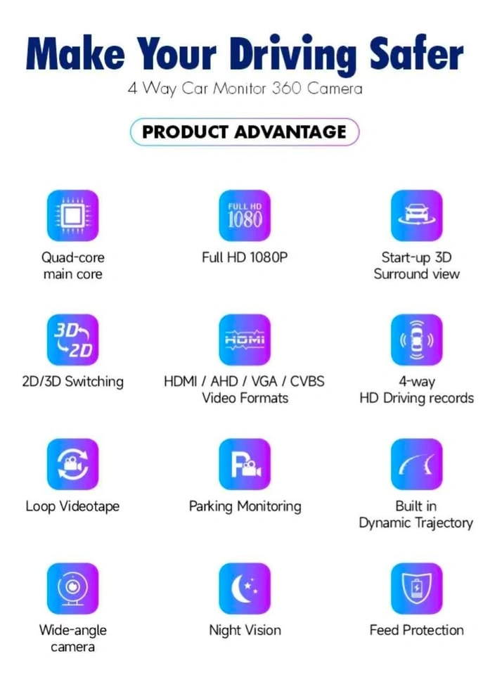 Upgrade your driving experience!!! Enhance your driving safety and make parking a breeze with this brand new Full HD 1080P 360 panoramic camera system! Features include: • Full HD 1080P resolution • 360° surround view • 4-way HD driving records • Parking monitoring & Night Vision • Dynamic trajectory & Loop recording Drive safer & park easier! Pickup at Wyandotte & McKay, Windsor, ON Grab yours TODAY @ McCay & Wyandotte, Windsor INSTALLATION = $150