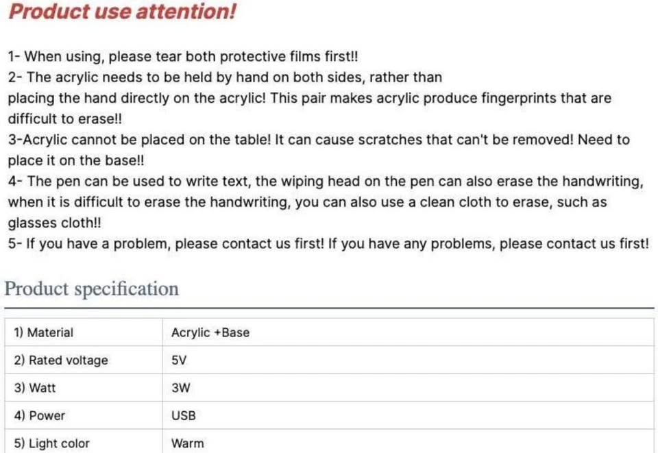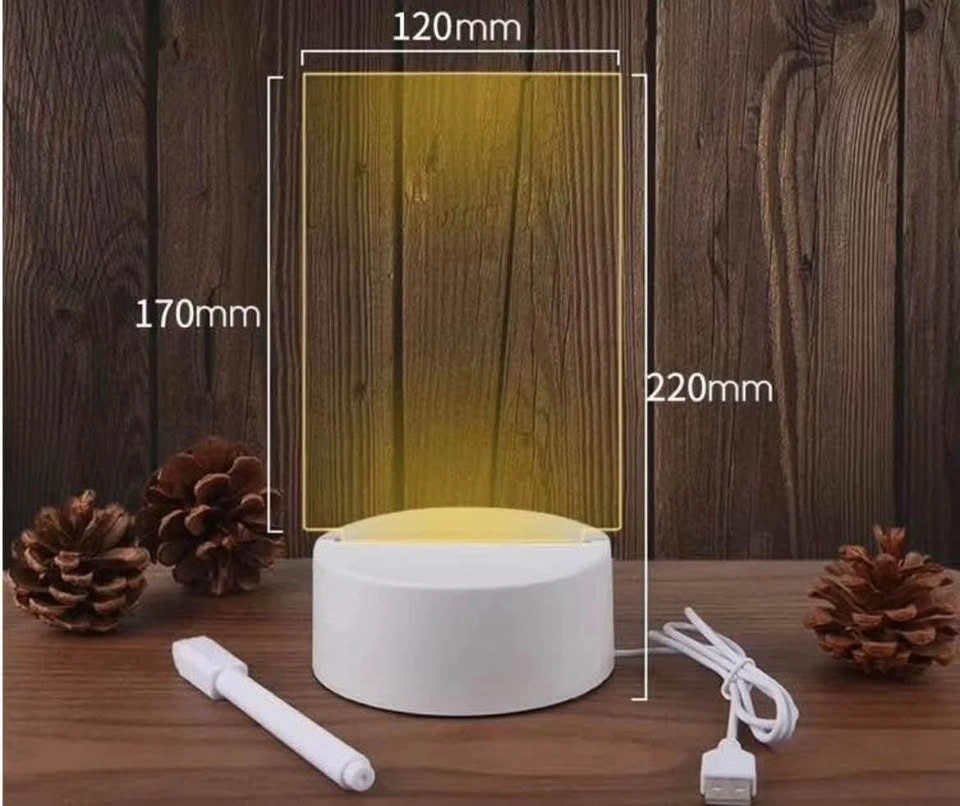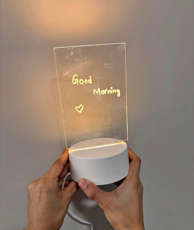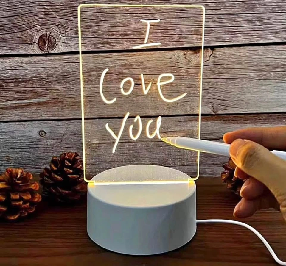 1123D Creative Visualization Lamp – $10 ✨ Unique LED Message Board Night Light ✨ This is a stylish, multifunctional LED night light that lets you write or draw personalized messages that glow beautifully! Perfect for notes, reminders, or a romantic touch. Features: ✅ Write & Erase – Use the included pen to write messages, then easily erase with a single rub. ✅ Warm LED Light – Soft, cozy glow makes it perfect for bedrooms, desks, or gifting. ✅ USB Powered – Comes with a USB cable for easy plug-and-play use. ✅ Acrylic Panel – High-quality transparent acrylic with a sleek modern design. Specifications: 📏 Size: 220mm x 120mm 🔌 Power: USB cable included 🖊 Includes: LED base, acrylic board, pen, and USB cable