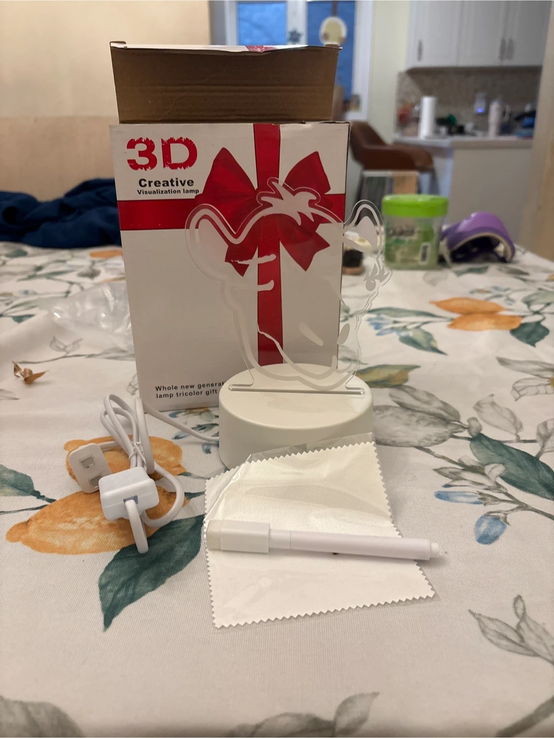 66I'm selling a 3D Creative Visualization Lamp! It's a whole new generation lamp with tricolor gifts. It comes with the box, power adapter, cleaning cloth and pen