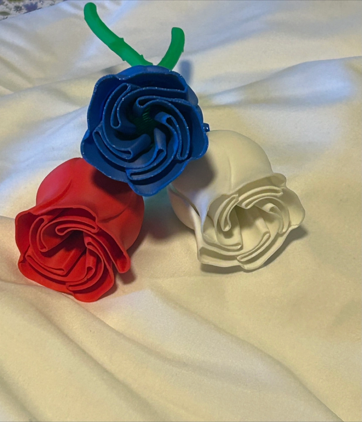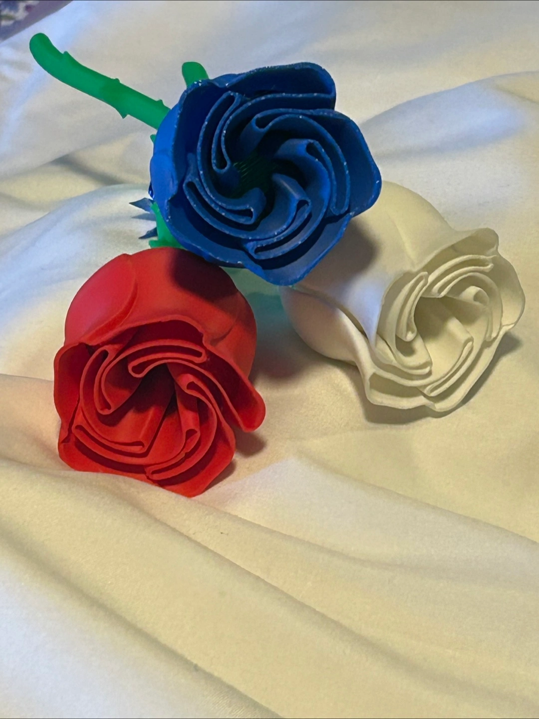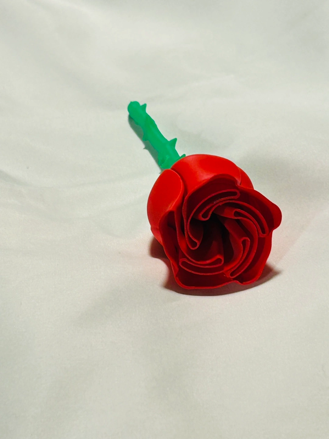 15Unique 3D printed rose. Each rose is made to order, they are 3-D print printed. One for $5 or five for $20 . The stem and rose petals are available in seven different colors. Red, cobalt blue, baby blue lime green, silver, black, white. Colours in photo are red and lime green. They are 7 (17.8 cm) inches tall.