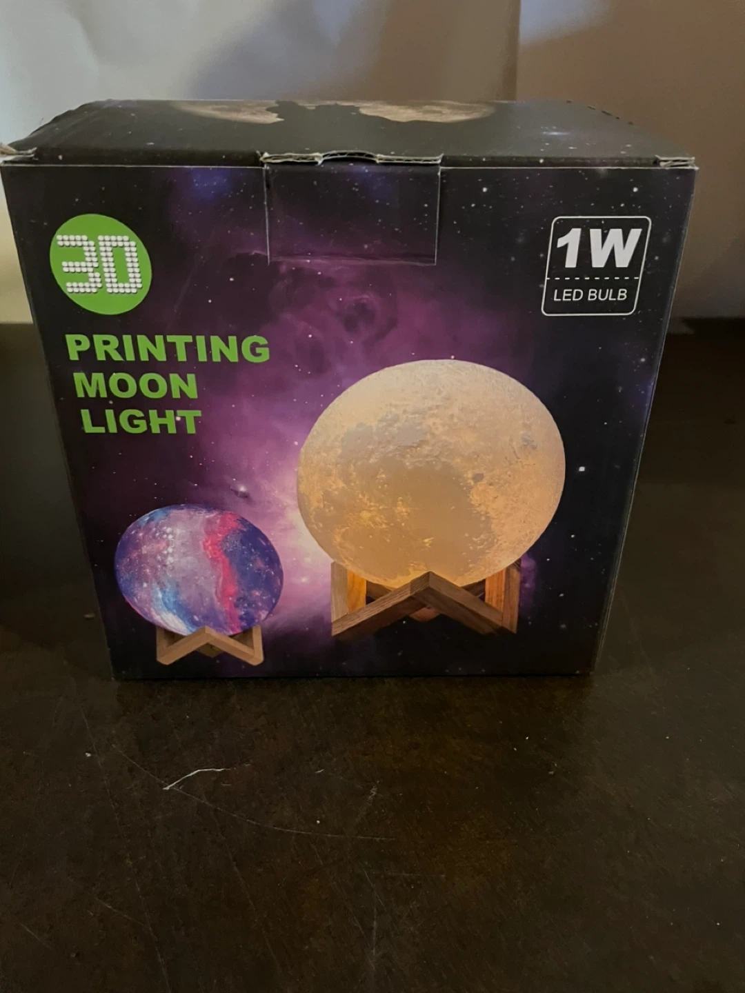 83Selling a 3D printing moon light! It comes with a remote control to change the colours. Also included are the wooden stand, and charging cable. The box is included as well. Never used, brand new.