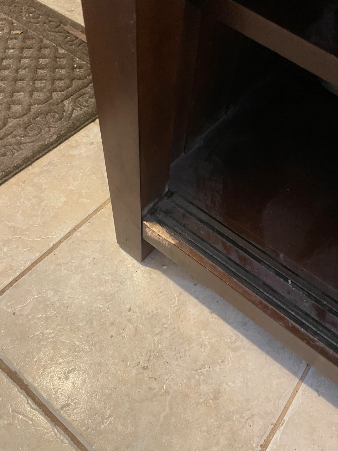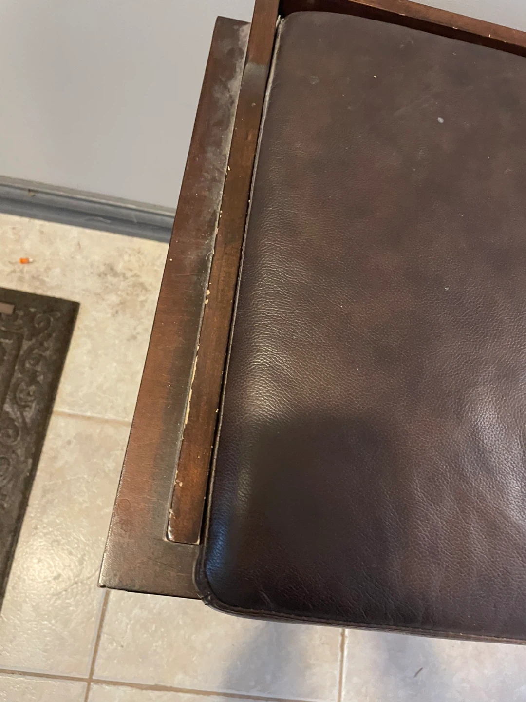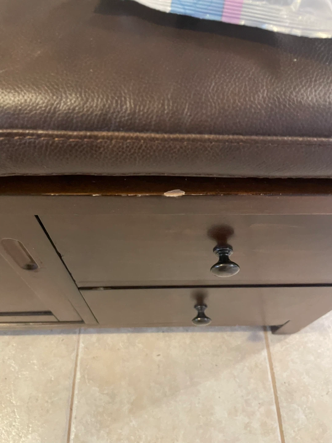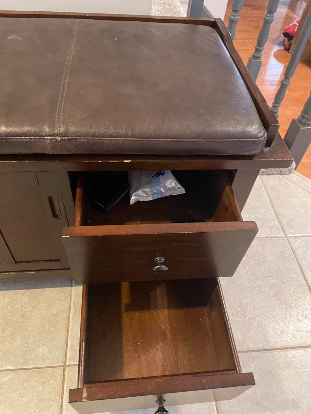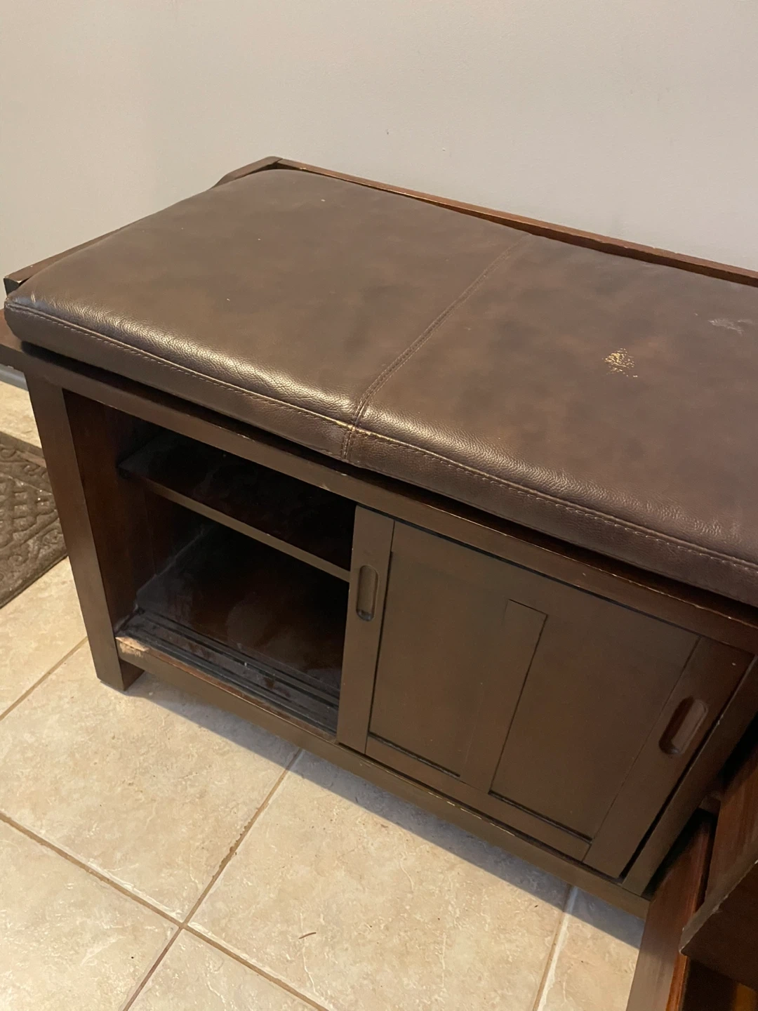 This dark brown entryway bench offers convenient storage with its sliding door cabinet and two drawers. The cushioned top provides a comfortable place to sit. Wood construction with faux leather seat.