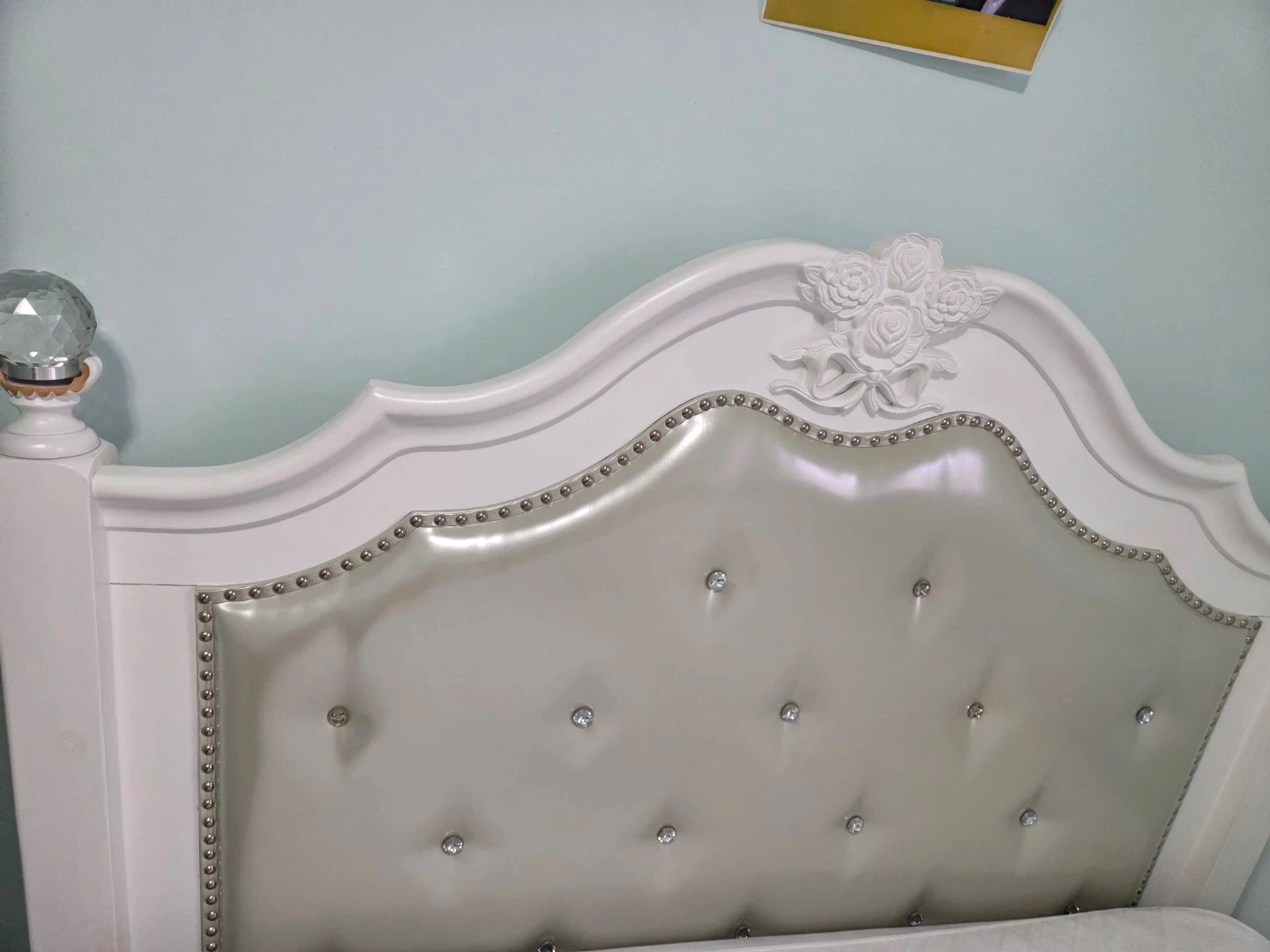Beautiful white Full bed frame with a padded, crystal-tufted headboard. It features ornate floral carvings on the footboard and headboard posts. A Serta mattress is included.