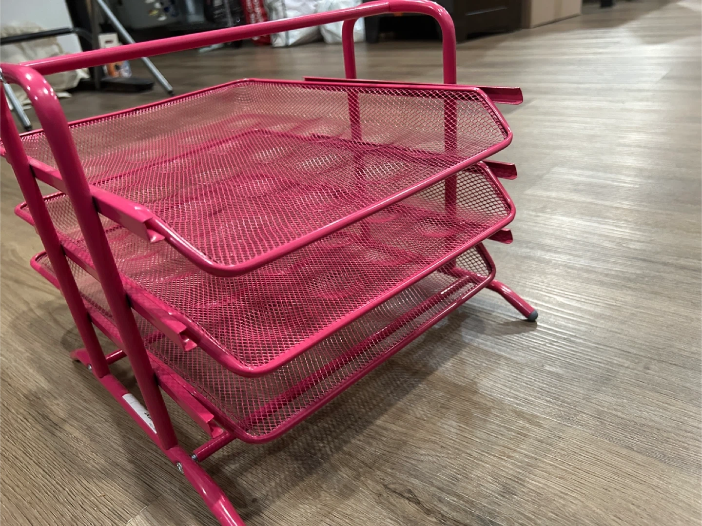 This is a pink, three-tier mesh desk organizer tray. It's made of metal and perfect for keeping your workspace tidy. It includes three sliding drawers for easy access to your papers.