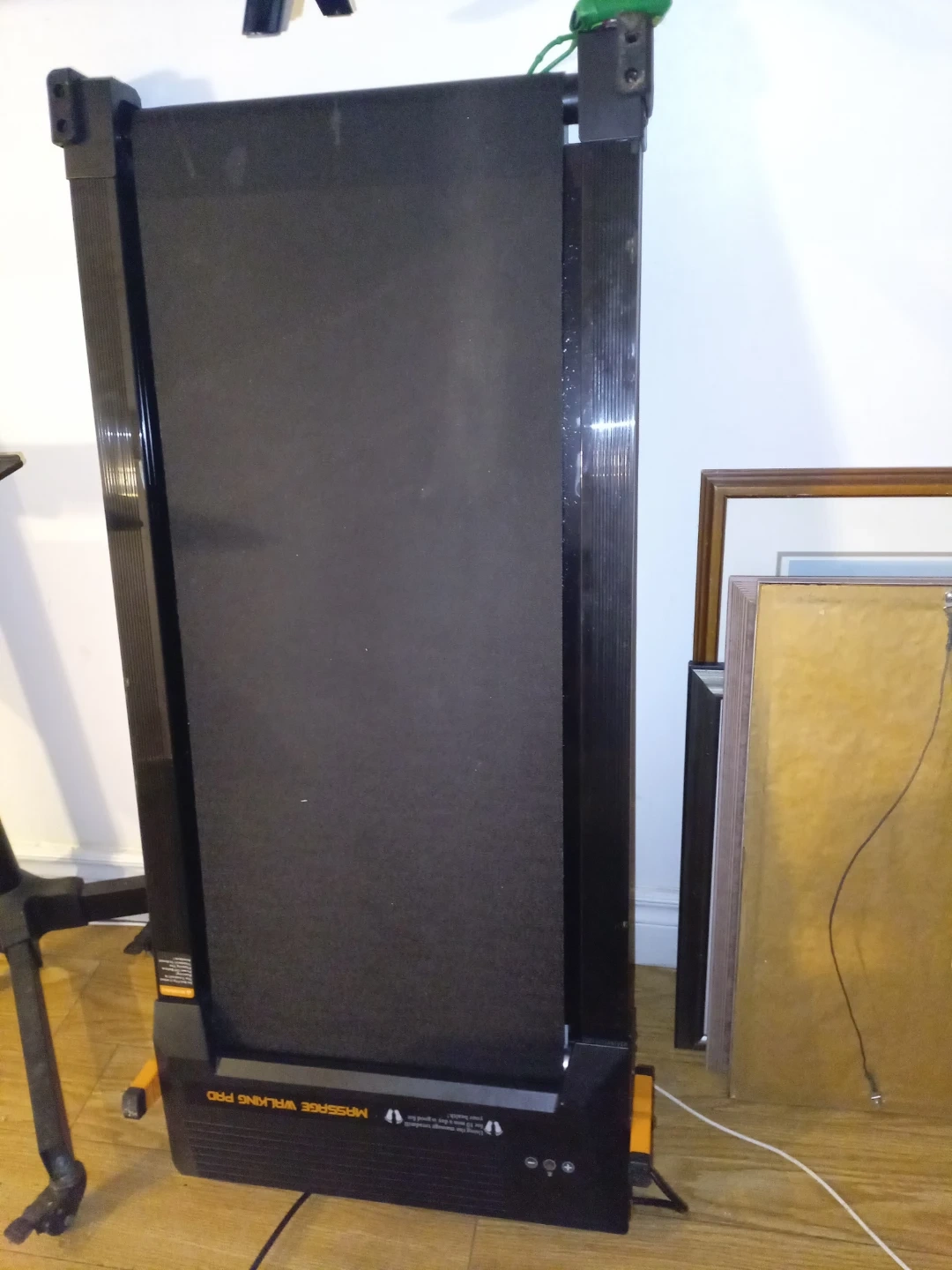 Massage Walking Pad Pro treadmill. It's black and has a running surface. Using the massage treadmill for 10 min a day is good for your health! Regular walking and on the reverse side is a massage walking pad.