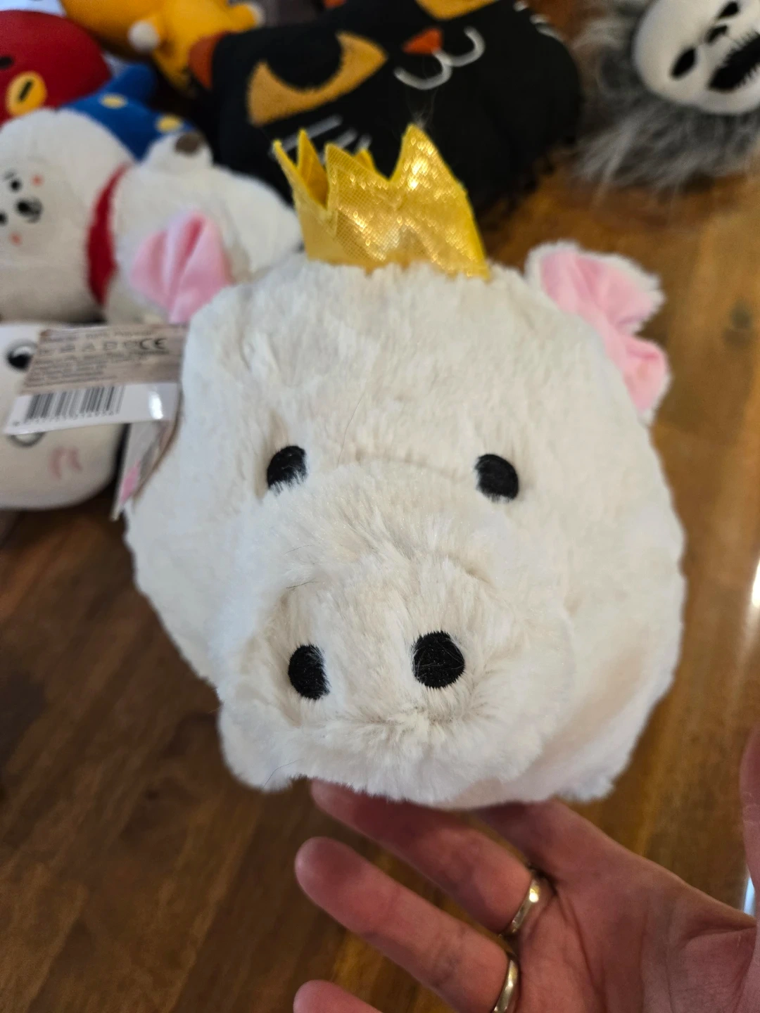 This is the Funky Piggy Family "Crystal" plush toy. It's soft and fuzzy with pink ears and a gold crown. It's a cute and cuddly companion.