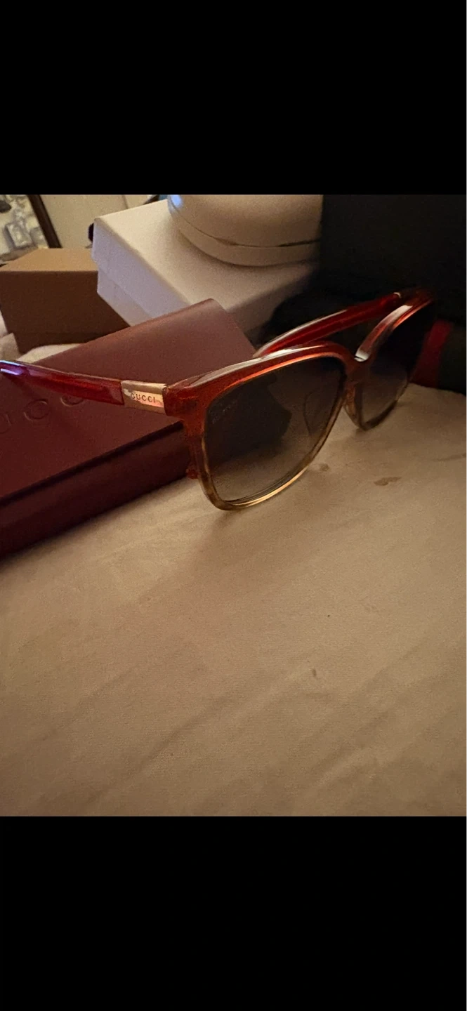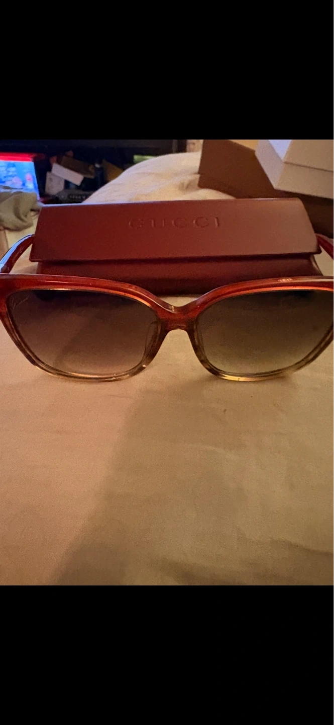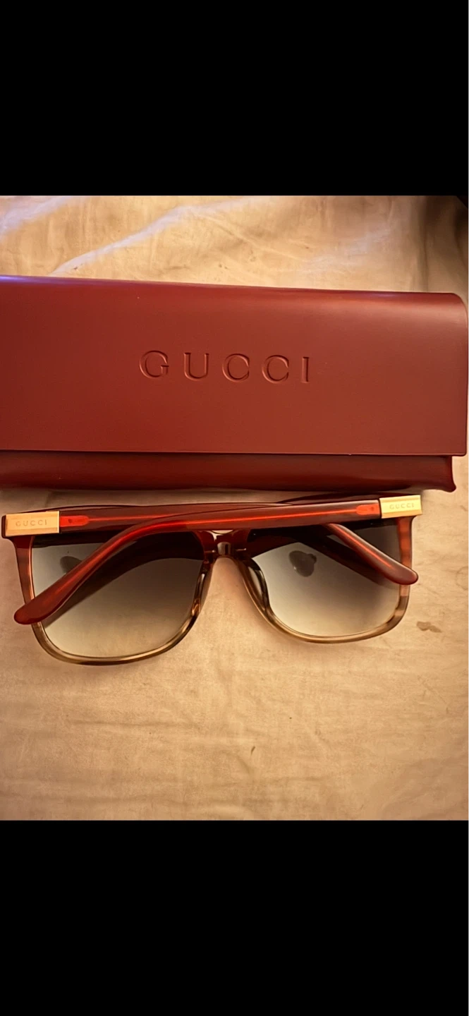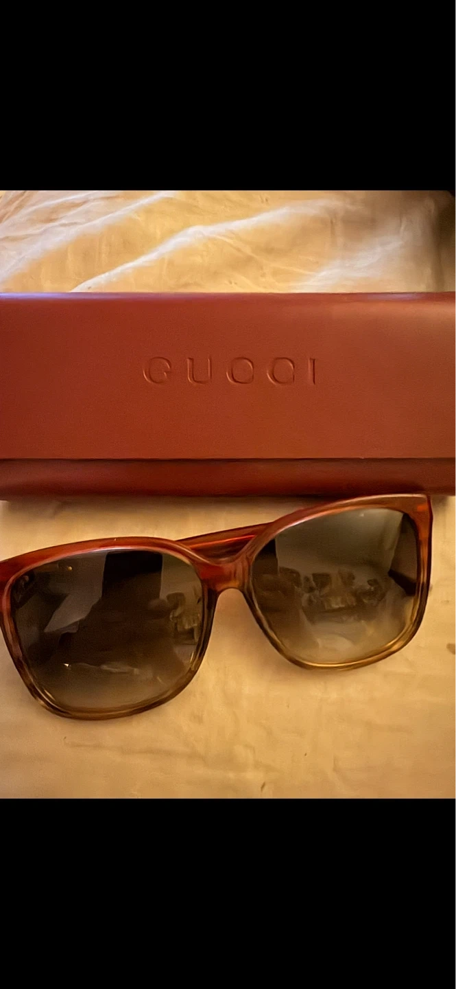 Brown gradient lens sunglasses. Features a tortoise shell pattern frame. Includes original Gucci hard case. Wellington and Halsted
