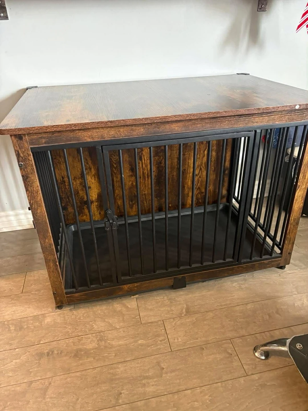 This stylish dog crate doubles as an end table, offering a comfortable space for your pet. It features a durable wooden frame with metal bars and a slide-out tray for easy cleaning. The top surface provides extra space for décor or lamps.