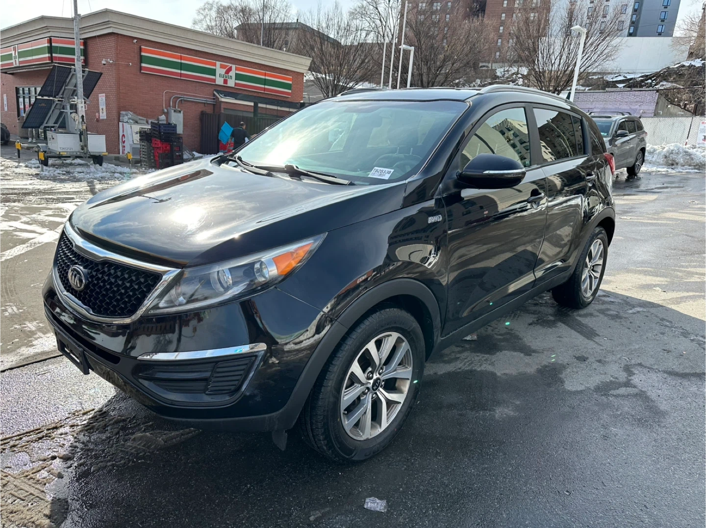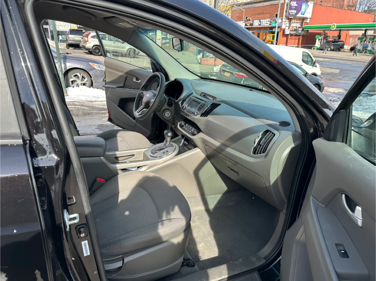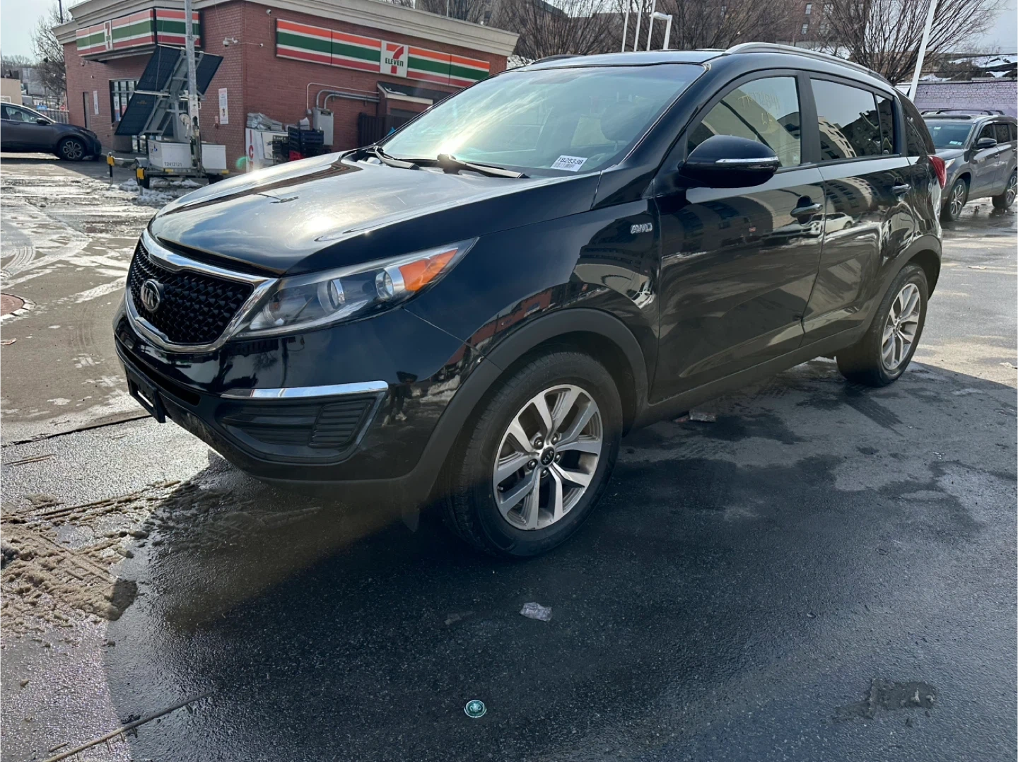 Black 2014 Kia Sportage EX with gray cloth interior. It's powered by a 2.4L GDI engine. Odometer shows 115,00 miles. Clean interior and engine bay.