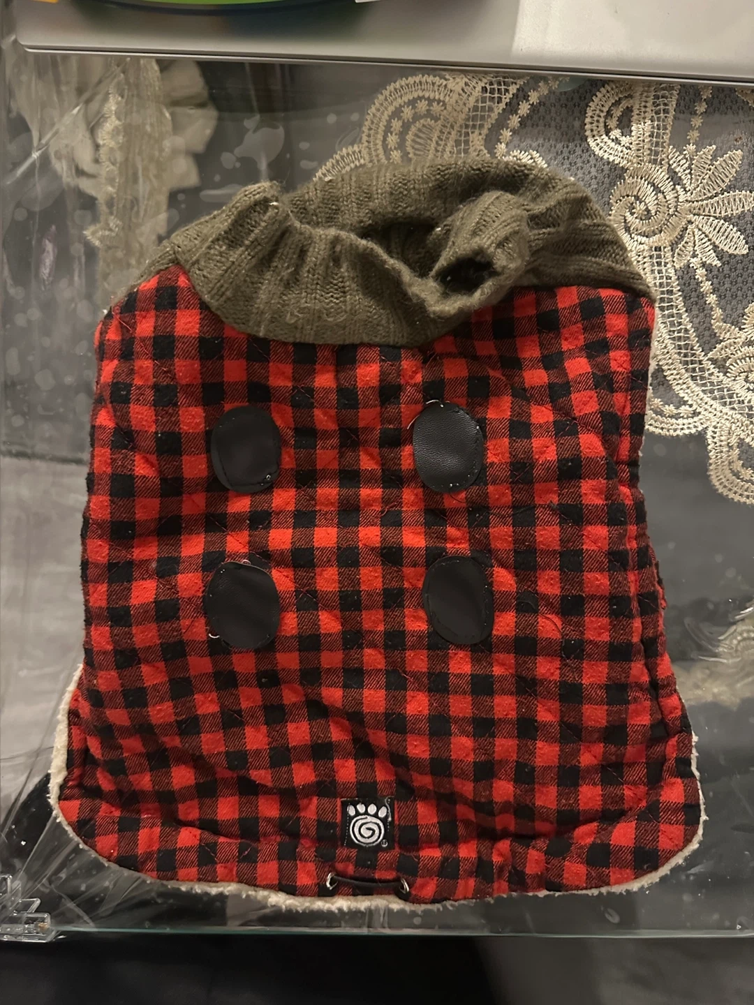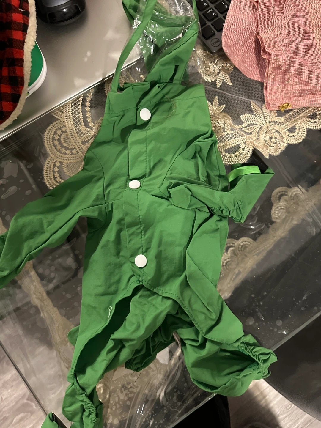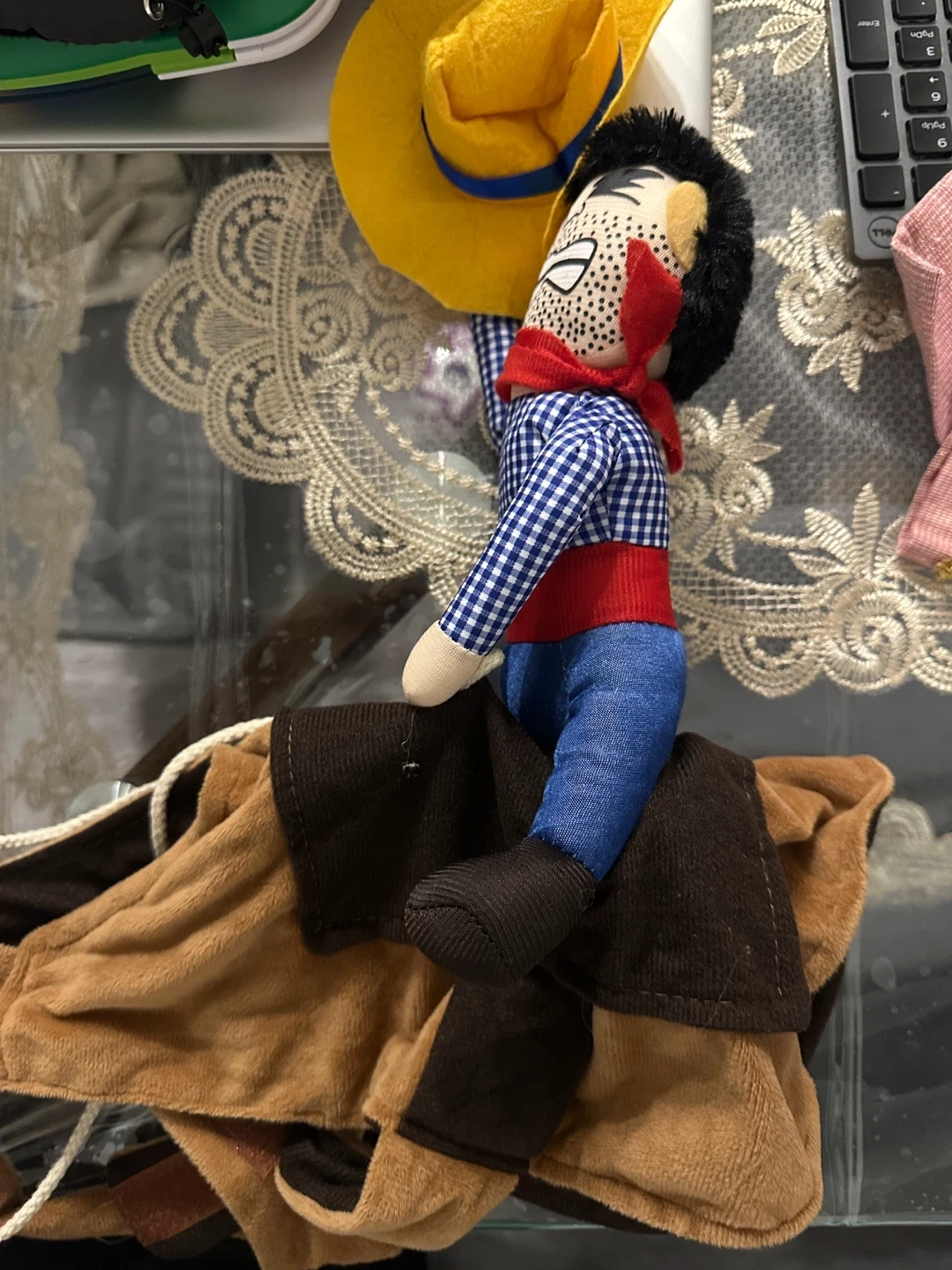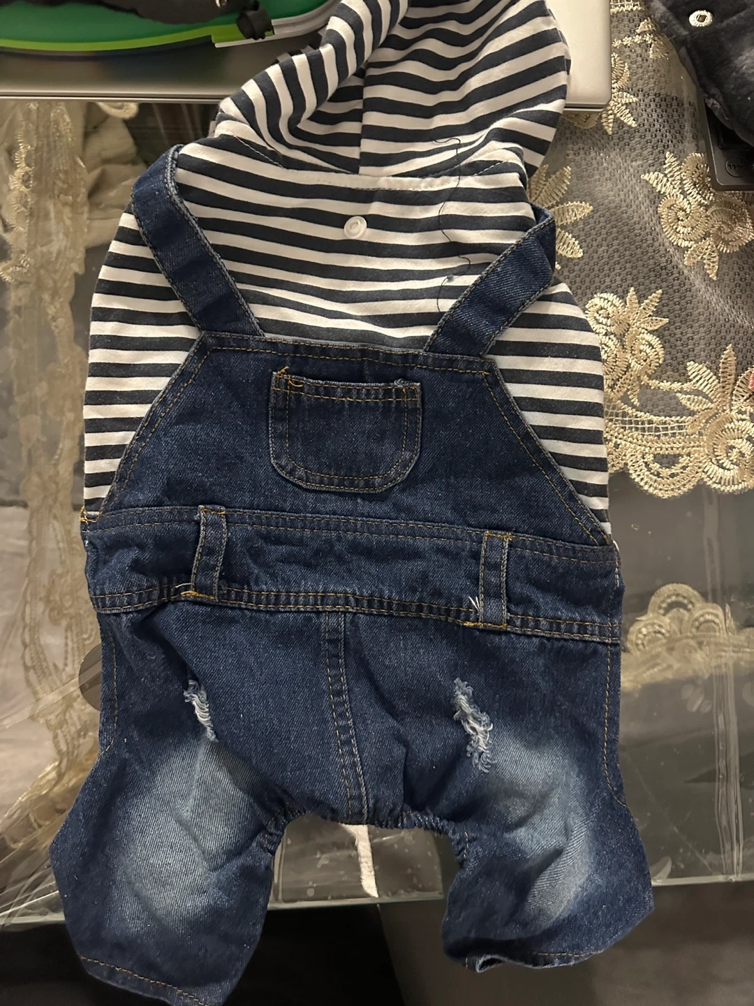 Includes a red and black buffalo plaid dog coat with a sherpa lining, a green dog raincoat with a hood, a red and white fair isle dog sweater with reindeer, and a denim overall set with a striped hoodie. There's also a cowboy doll costume.