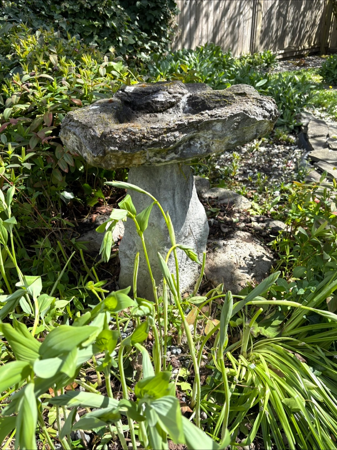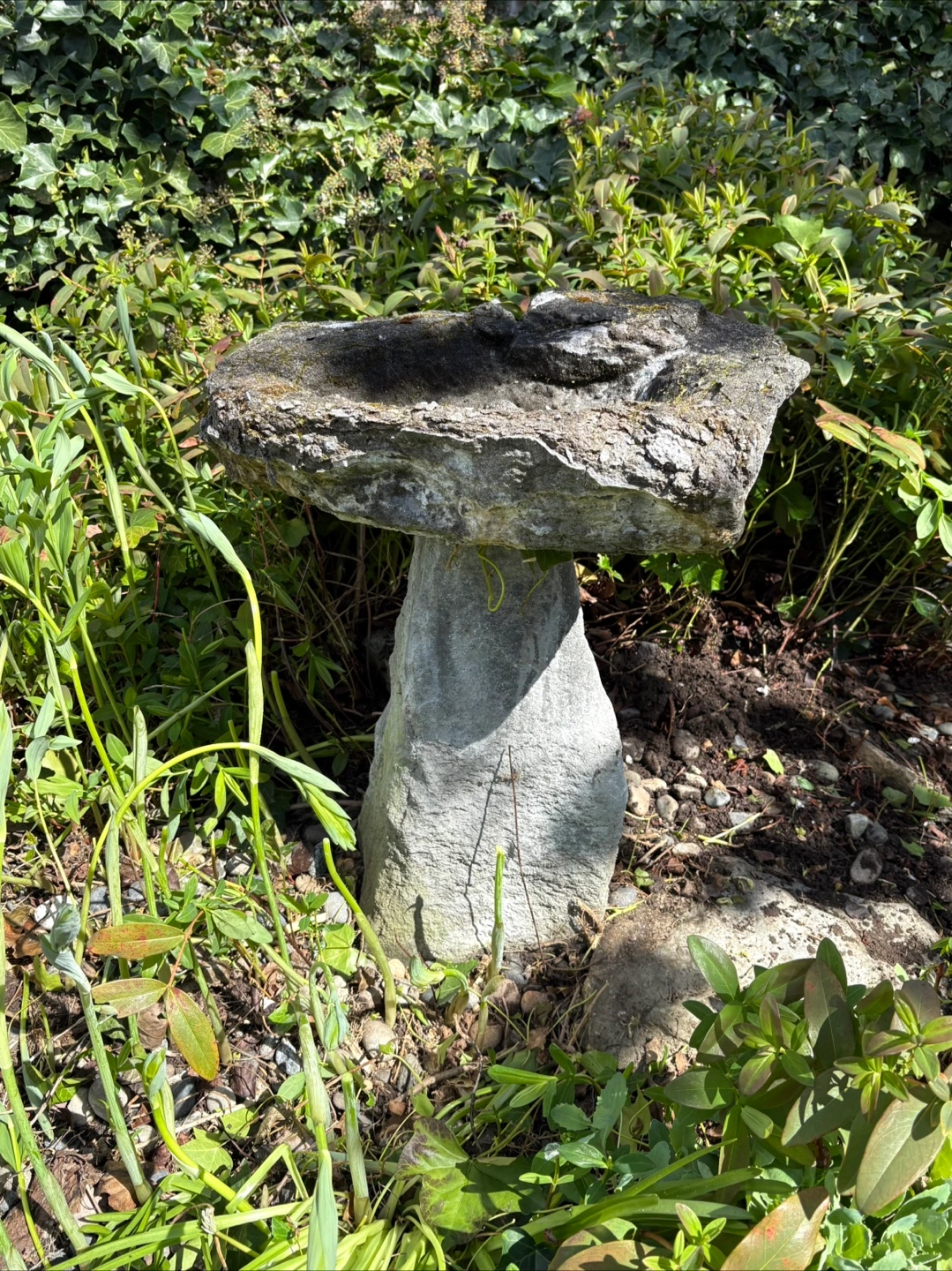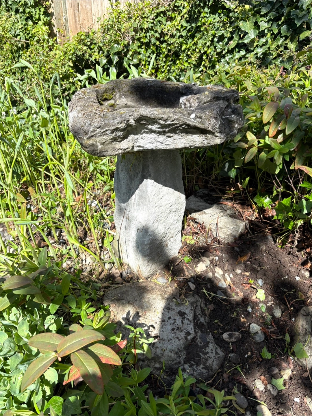 A charming bird bath made from concrete mixed with stones (not exactly know the mix of it), perfect for adding a rustic touch to your garden.