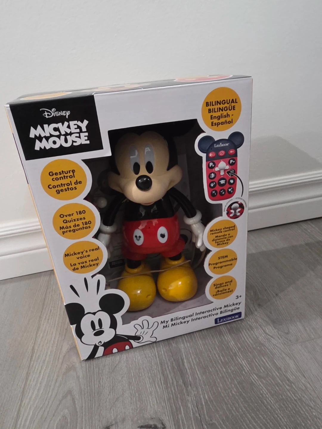 This Disney Mickey Mouse toy is bilingual, speaking in both English and Spanish. It has gesture control and over 180 quizzes. It also sings and dances, offering STEM programmable features. Suitable for ages 3 and up.