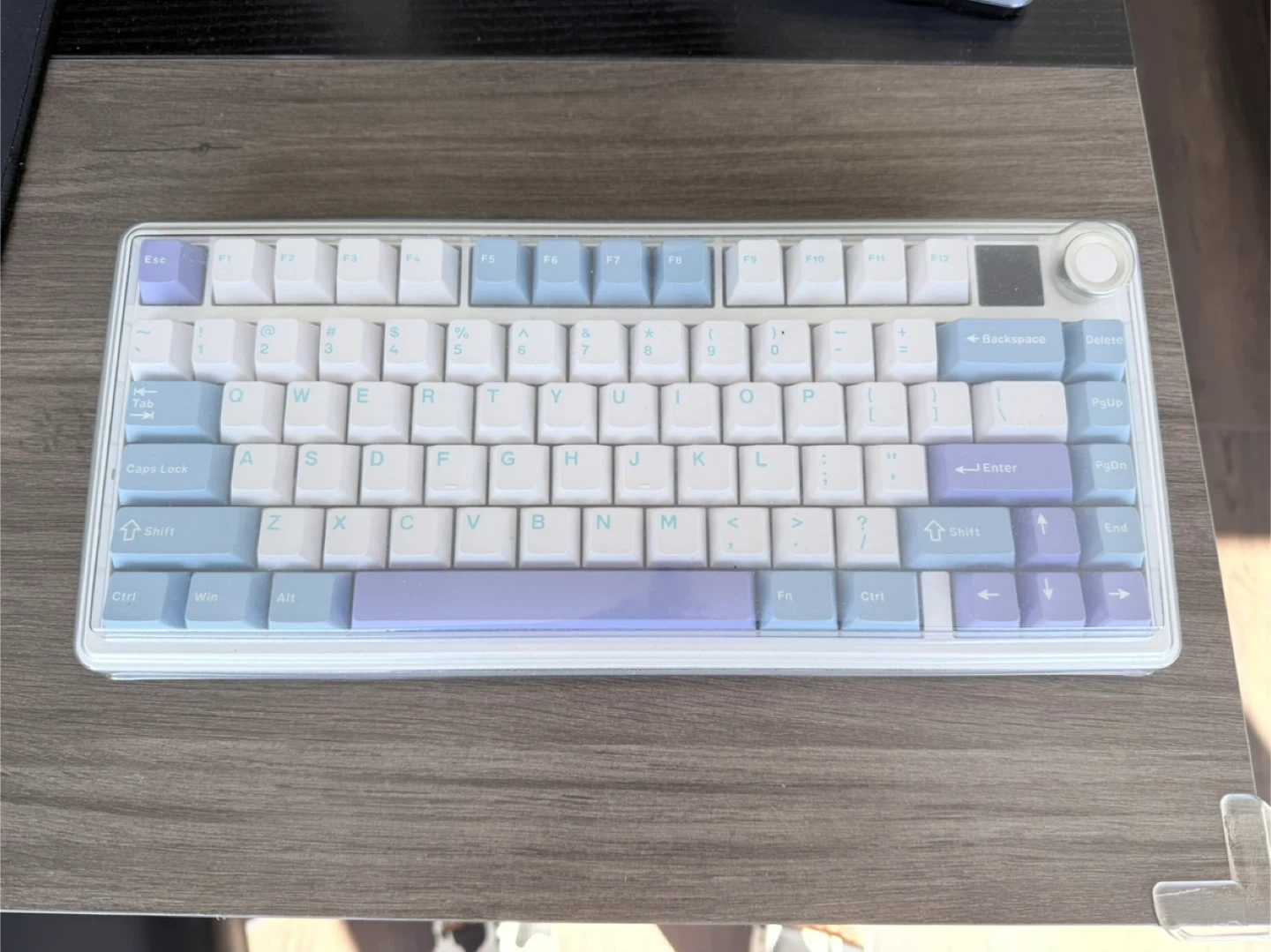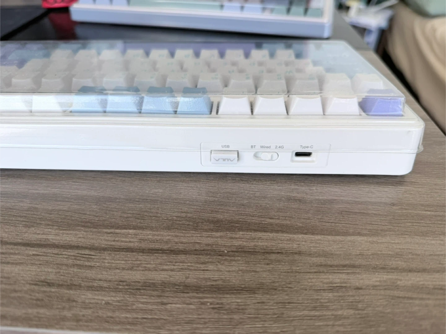 This is the AULA F75MPX 75% hot-swappable mechanical keyboard. It's a gasket-mounted keyboard with a rotary knob. It offers USB, Bluetooth, and 2.4G wired connectivity options.