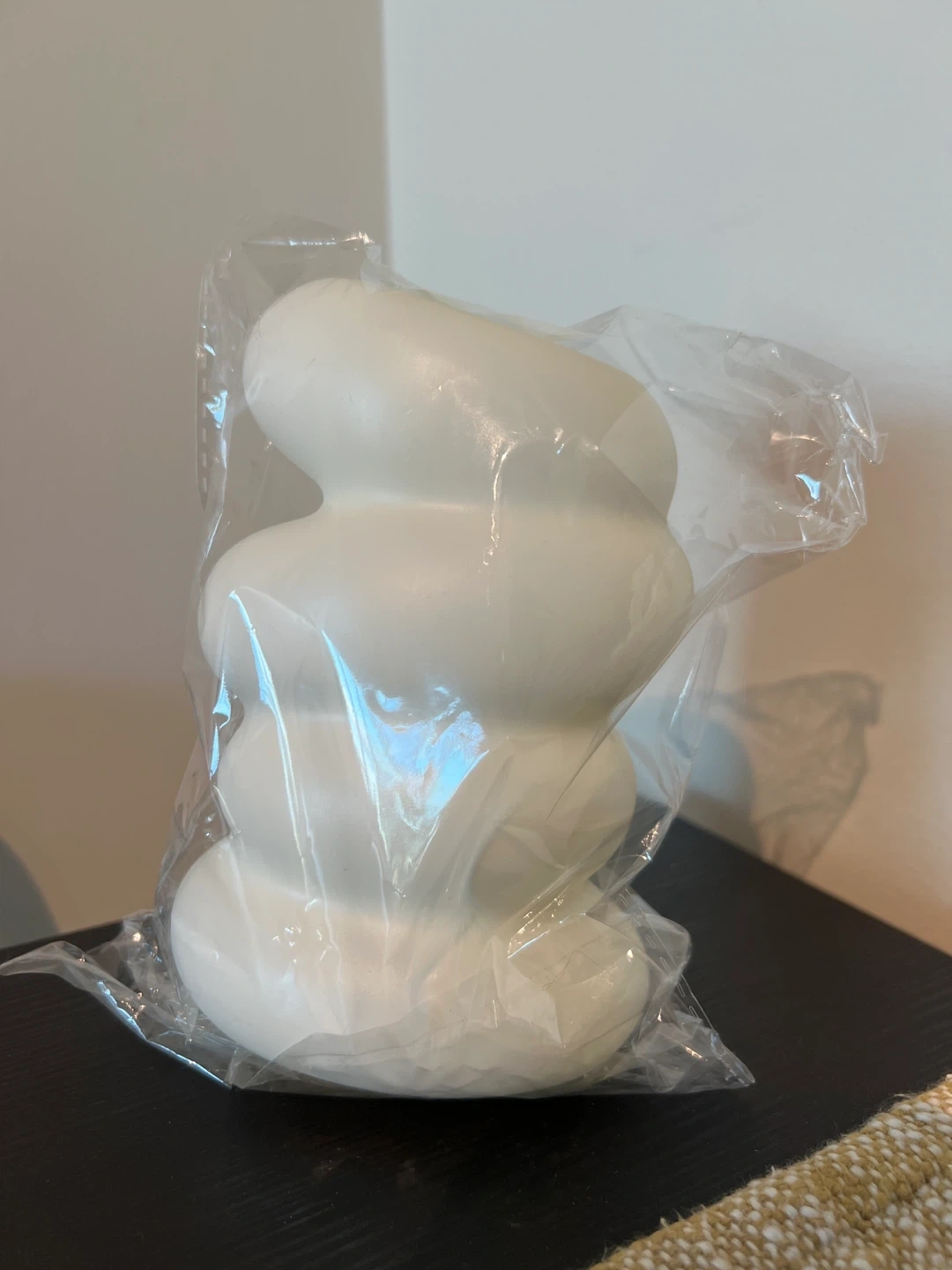 This white vase has a unique bulbous, twisted shape. It's made of plastic and measures 15cm (5.91 inches) tall and 9cm (3.54 inches) wide. It's a stylish decorative piece for your home.