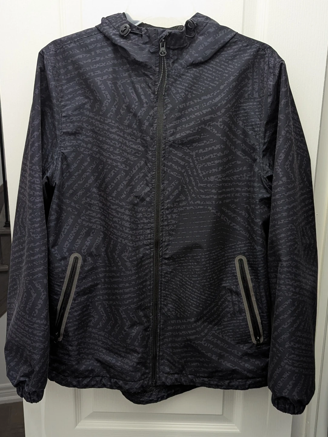 Selling a unisex rain coat in great condition! It's perfect for those windy days or light rain. The jacket has a hood and a stylish pattern, making it both functional and fashionable.