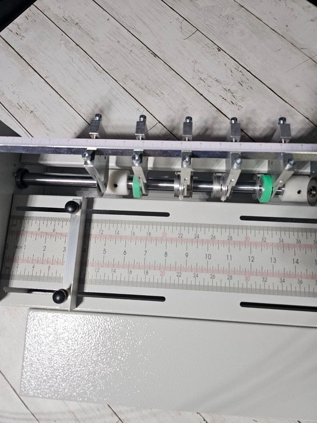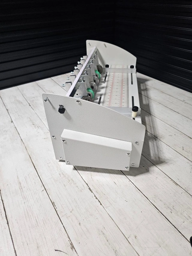 This is a new 3-in-1 electric creasing machine, 18 1/2 inches (470mm) wide. It can score, perforate, and cut paper, making it great for cards, invitations, and tickets. It comes with 3 specialized blades: a creasing blade (adjustable width 1.0/1.2/1.5mm), a perforation blade for dotted lines, and a cutting blade for trimming. It handles paper thicknesses from 60-500 gsm. The machine features a user-friendly design with a hexagonal blade holder for stability and a T-shaped paper feed guide for precise alignment. You can easily adjust blade positioning and height with simple screw adjustments. It's ideal for various projects like greeting cards, menus, and more. The machine operates at 25r/min. This is for sale by owner. Feel free to message if you have any questions!