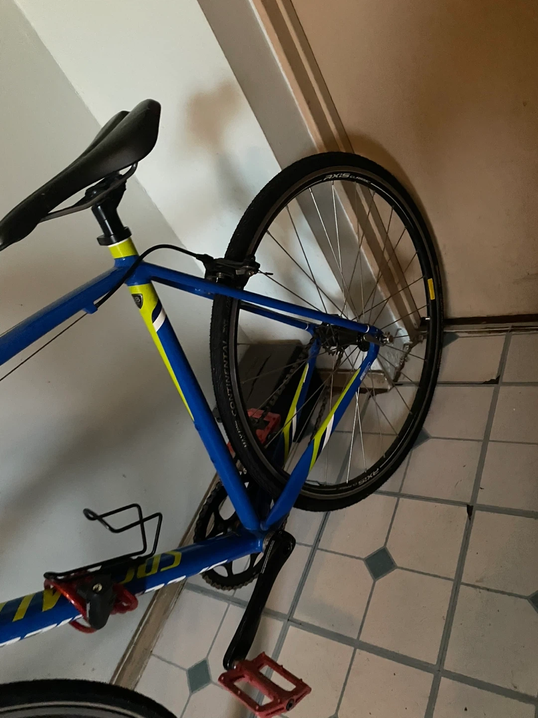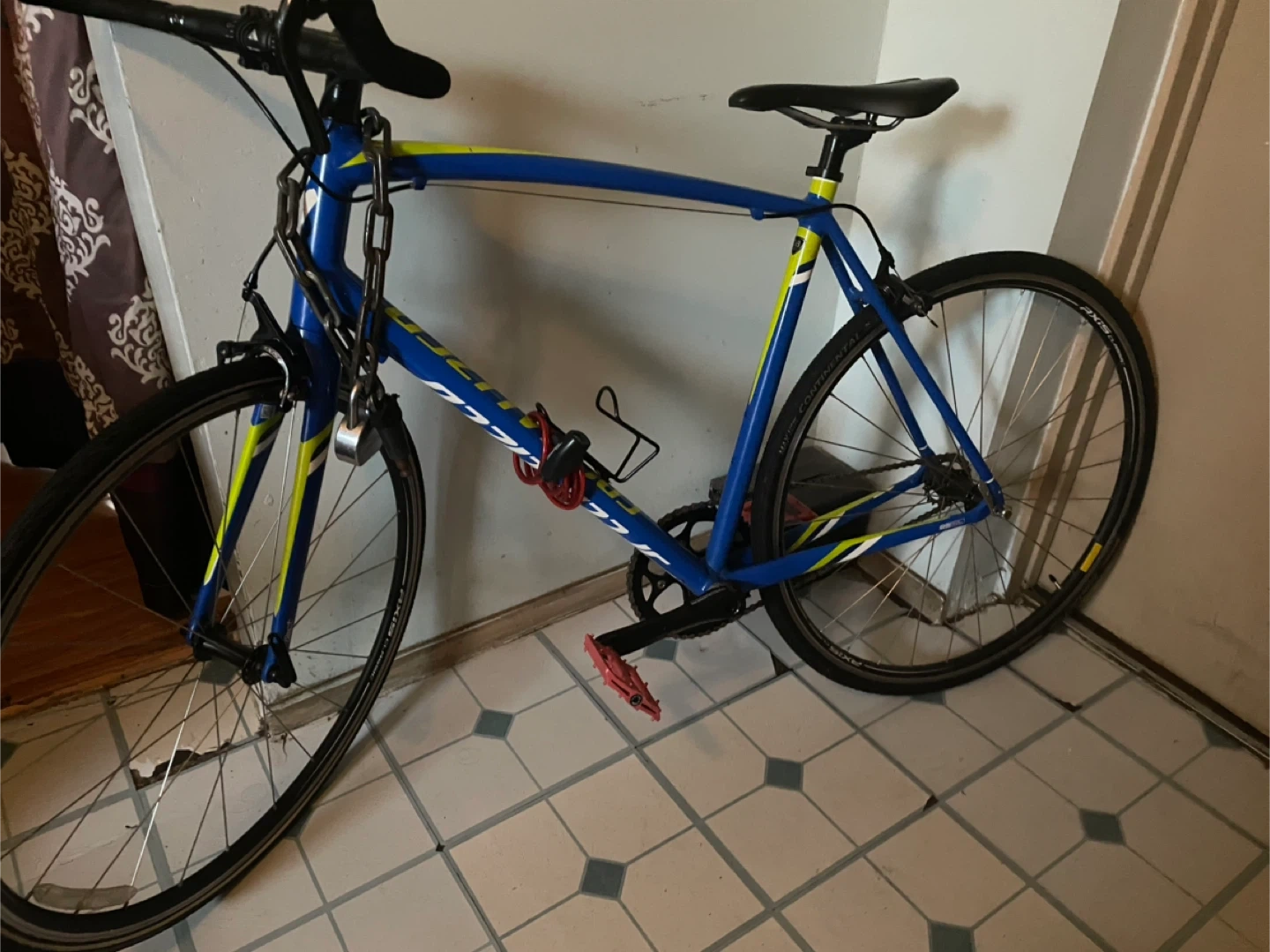 Selling a Specialized road bike in blue and yellow. It shows some signs of use but is still in good condition for riding around town. Perfect for someone looking for a reliable bike!