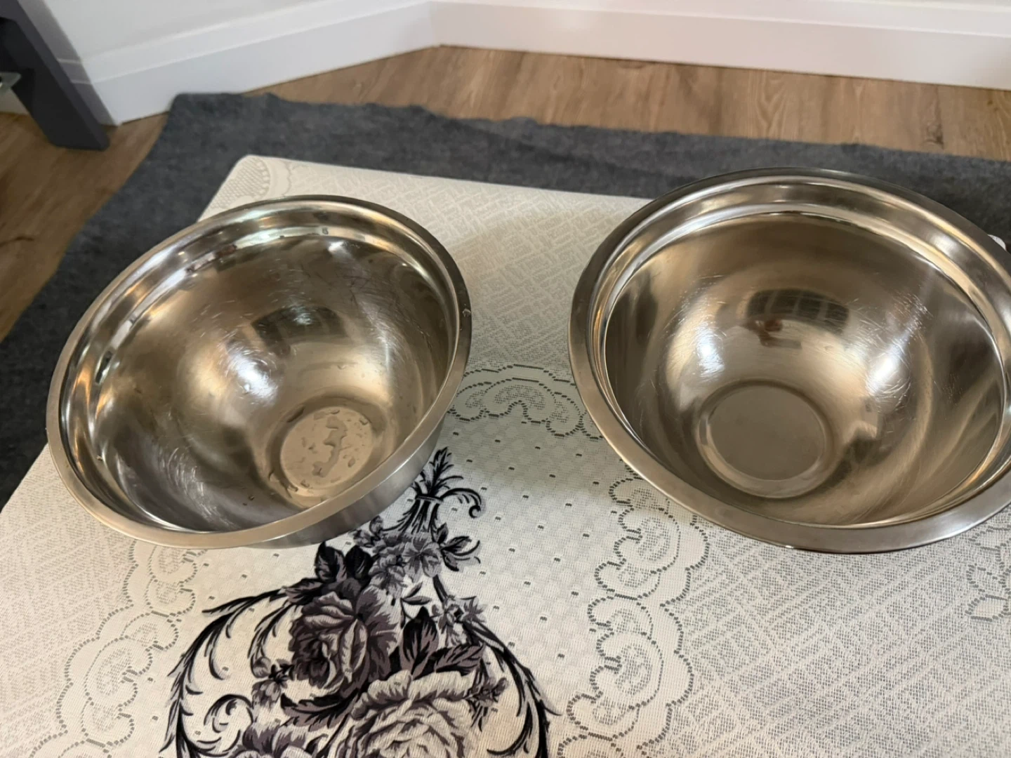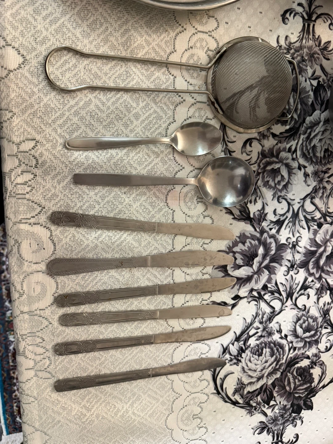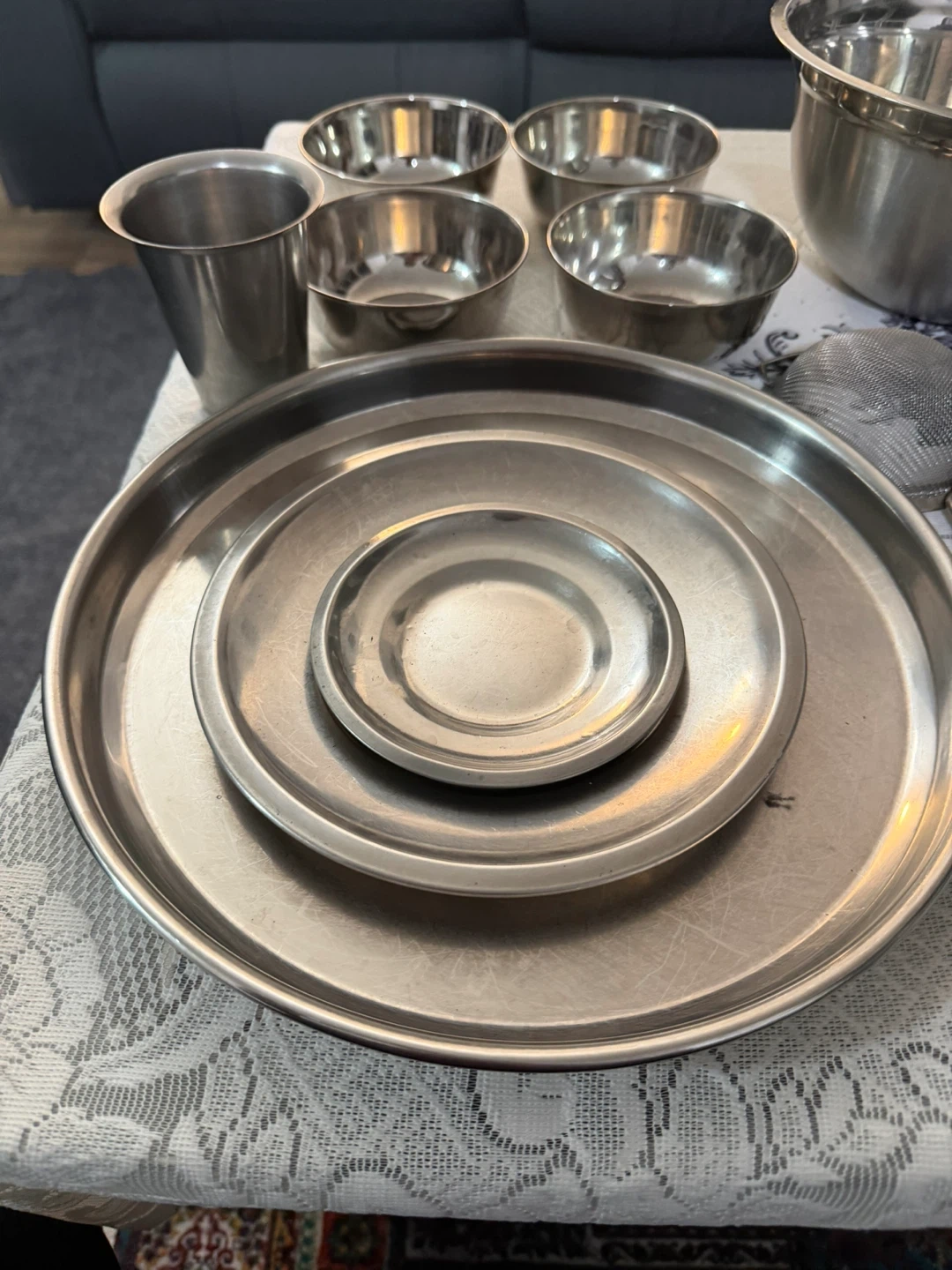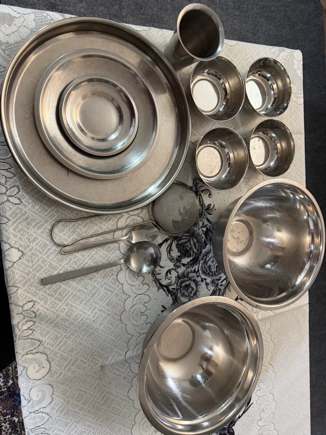 A set of stainless steel mixing bowls and various kitchen utensils. Includes multiple bowls, plates, cups, spoons, knives, rolling pin and a strainer.