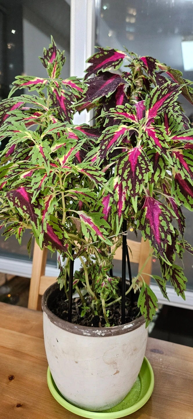 A vibrant potted Coleus plant with striking green, burgundy, and pink foliage. Comes in a light-coloured ceramic pot with a green saucer. It's a healthy plant, ready to brighten up any indoor space!