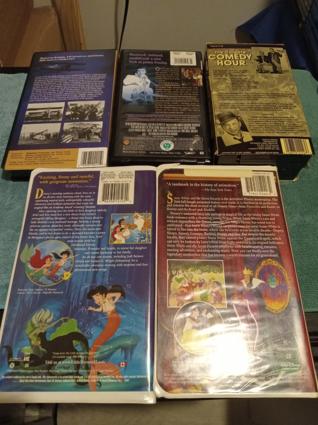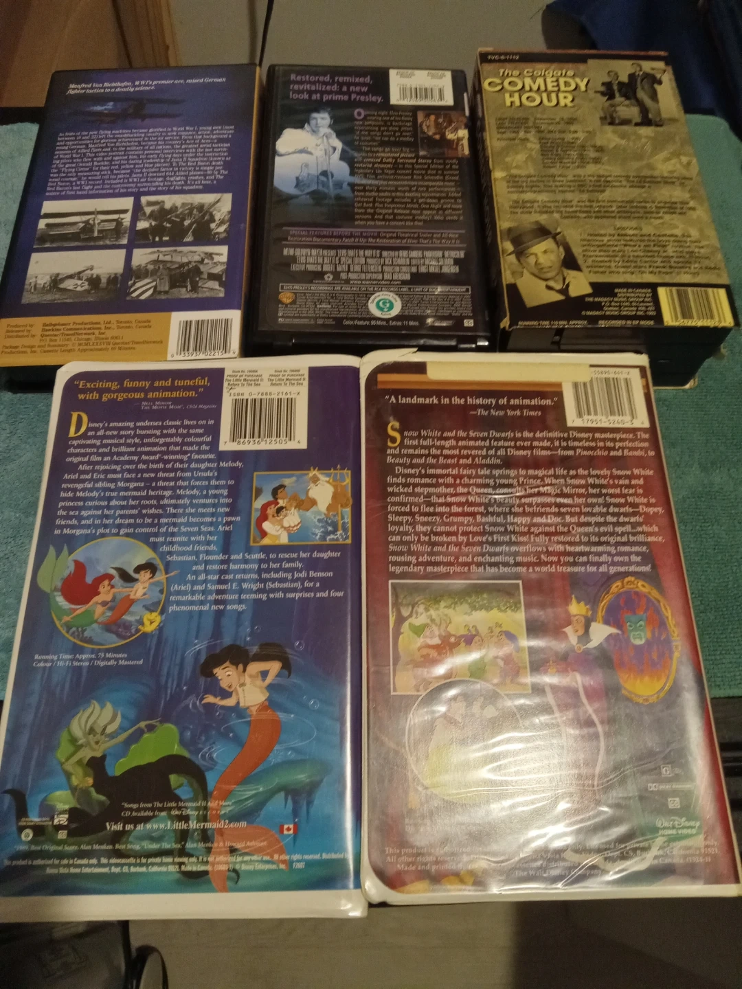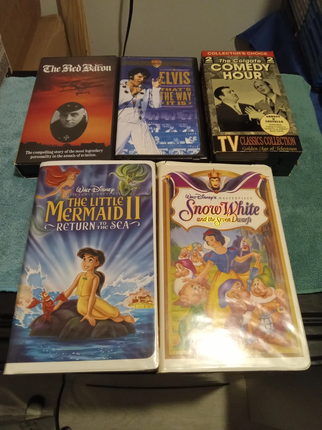 This collection includes five VHS tapes featuring a variety of genres. You'll get 'The Red Baron', 'Elvis: That's the Way It Is', 'Collector's Choice: The Colgate Comedy Hour', 'Disney's The Little Mermaid II: Return to the Sea', and 'Disney's Snow White and the Seven Dwarfs'. These tapes are great for nostalgic movie nights.