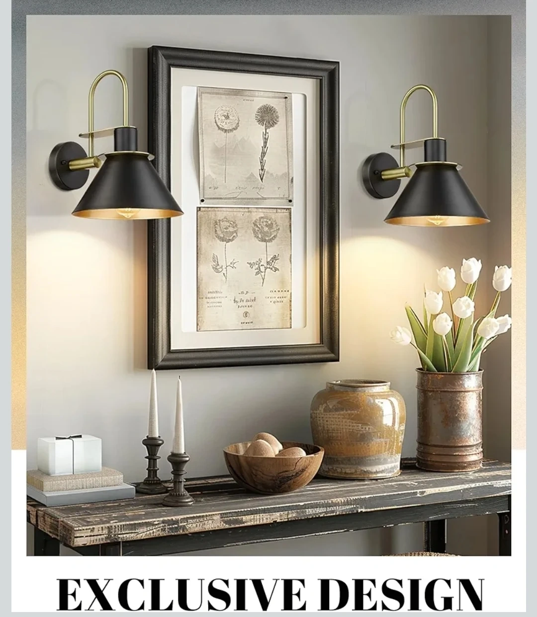 This industrial indoor wall sconce features a black and gold finish. It's a single vanity light barn sconce lamp, suitable for a bedroom, kitchen, or hallway. US standard E26 socket, max 60W/120V. Bulb not included. Dimensions: 13.7" H x 9.8" W x 12.6" D.