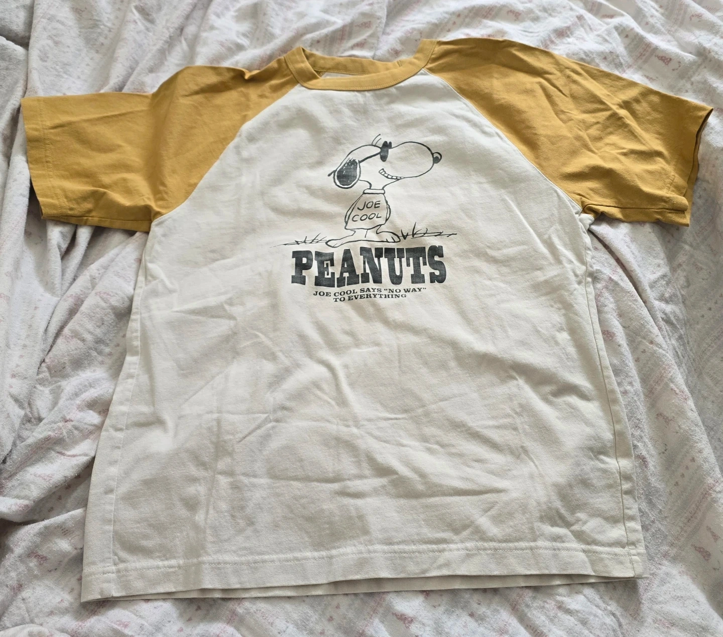 UNIQLO graphic t-shirt with a Peanuts Joe Cool design. Features contrast mustard yellow raglan sleeves. Made in Vietnam. Size is small.