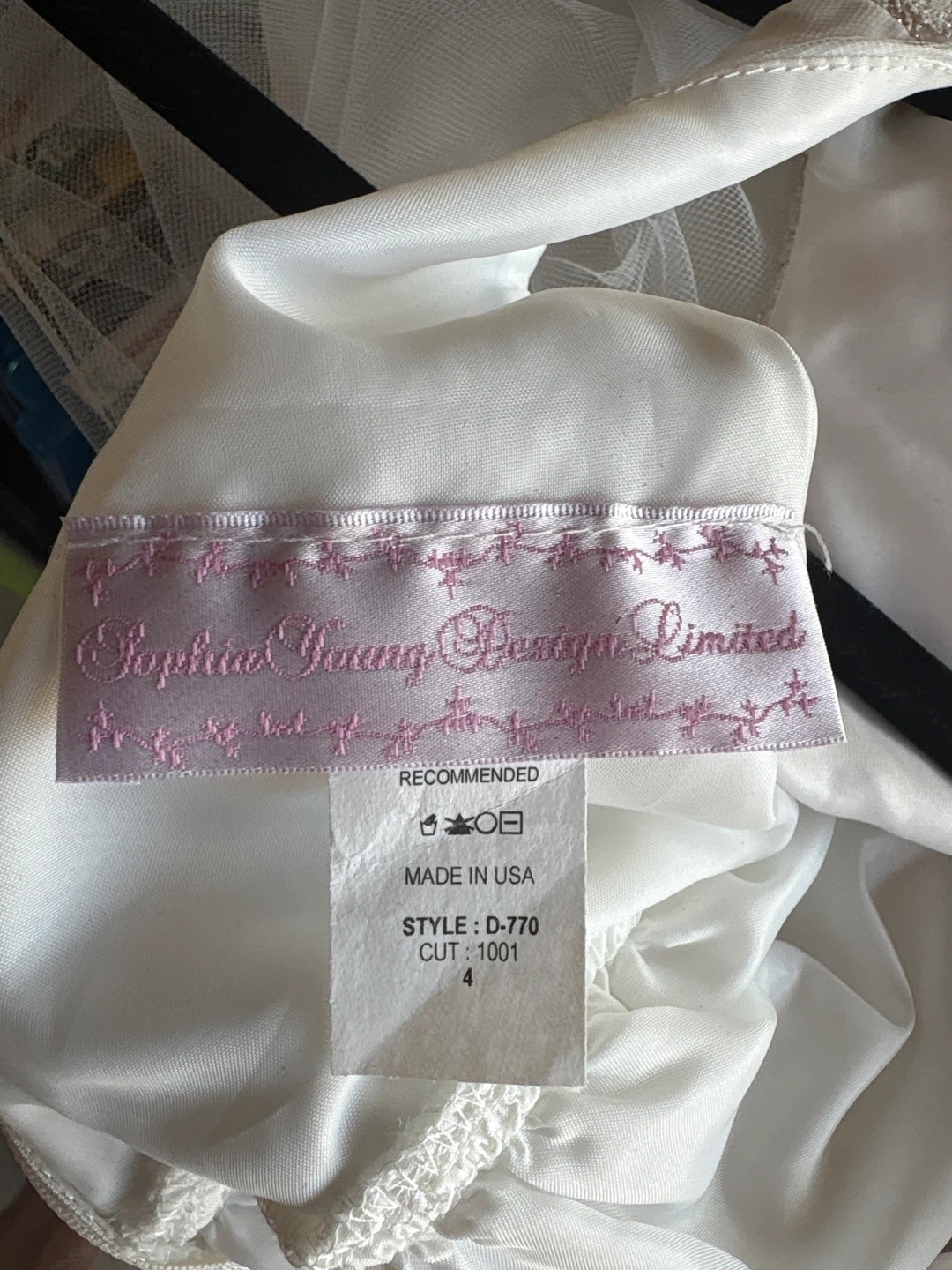 A beautiful dress from Sophia Young Design Limited in a size 4! The dress features a lovely lace bodice and a tulle skirt. Perfect for a special occasion!