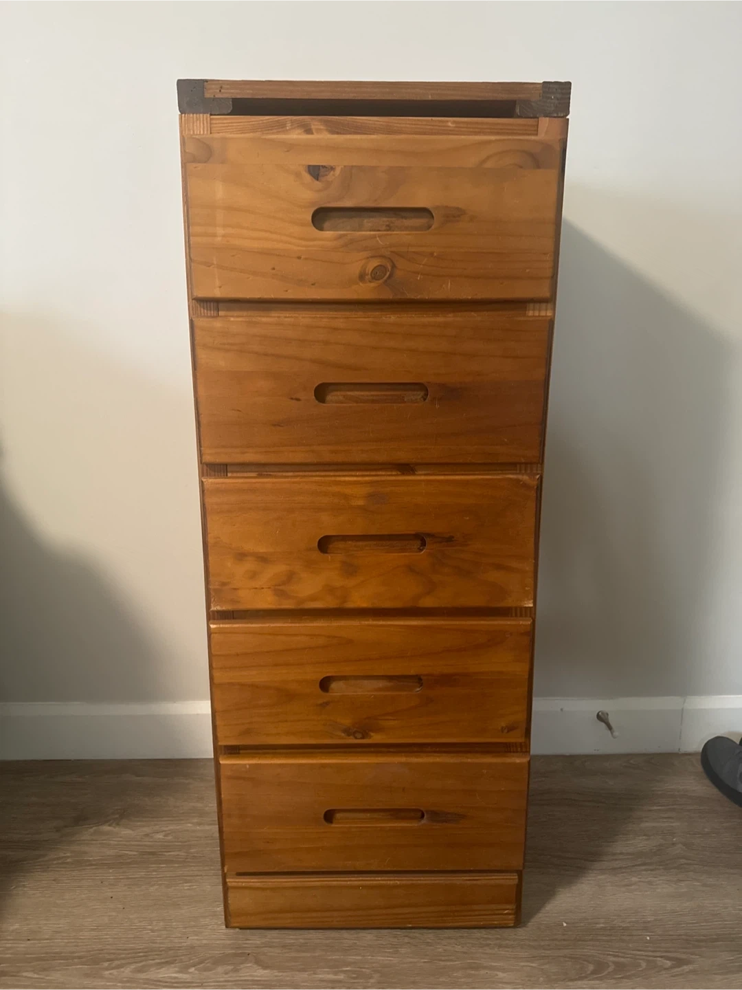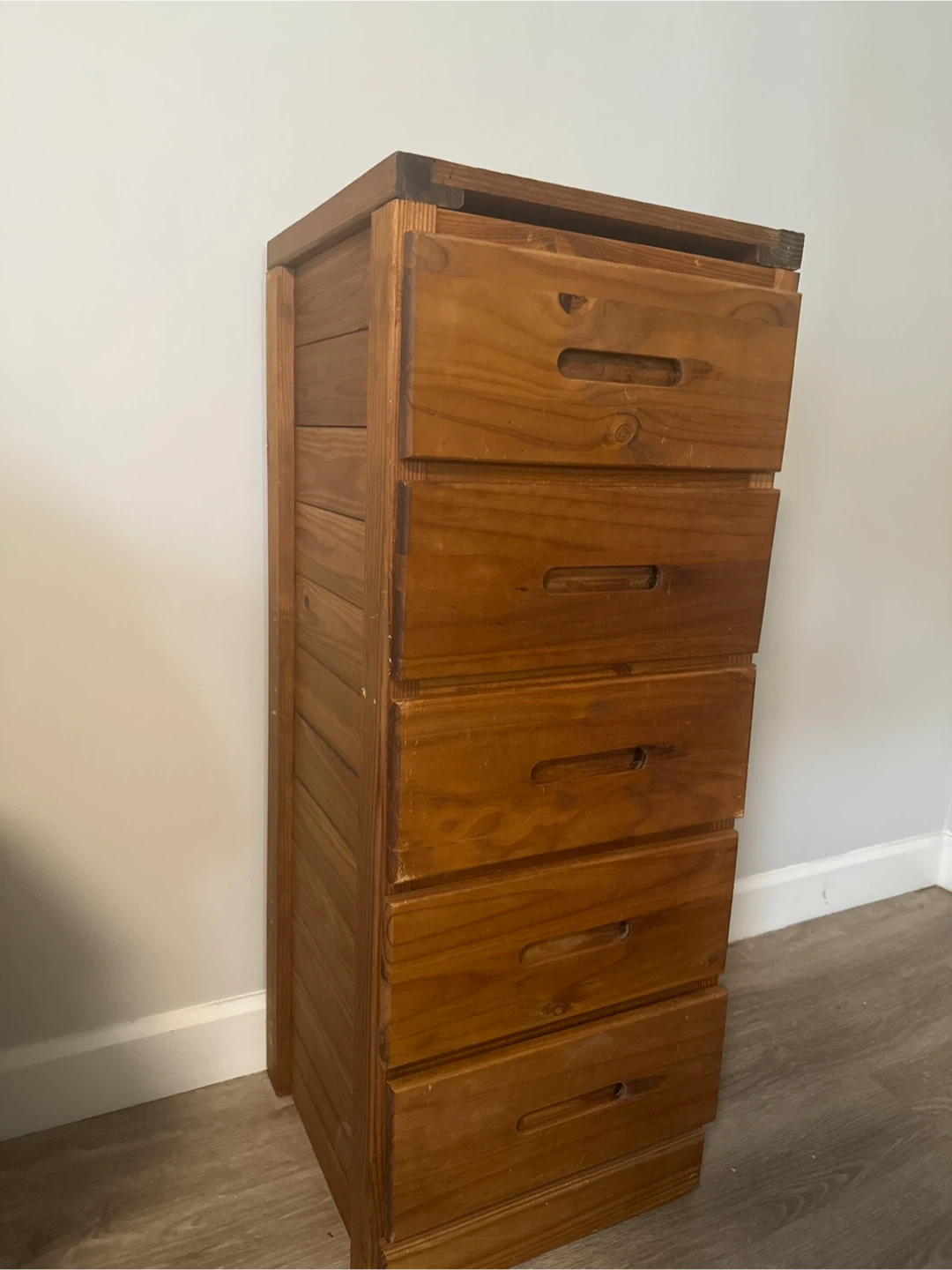 This is a solid wood chest with five drawers. It's made of pine and has a warm, natural finish. Perfect for storing clothes or other household items!
