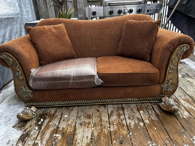 Comfy brown loveseat with nice fabric and cool carved wood arms and feet. One seat cushion is still wrapped in plastic, and the other cushions are in good shape. Comes with two matching throw pillows. The wooden feet were taken off for easier moving.