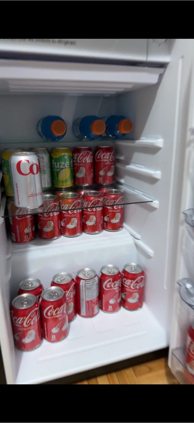 Hamilton Beach compact refrigerator in black. It has adjustable temperature control and reversible door. Interior includes shelving and door bins. Inside is still have wrapping.