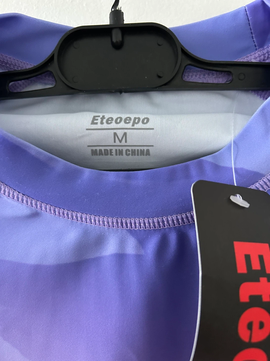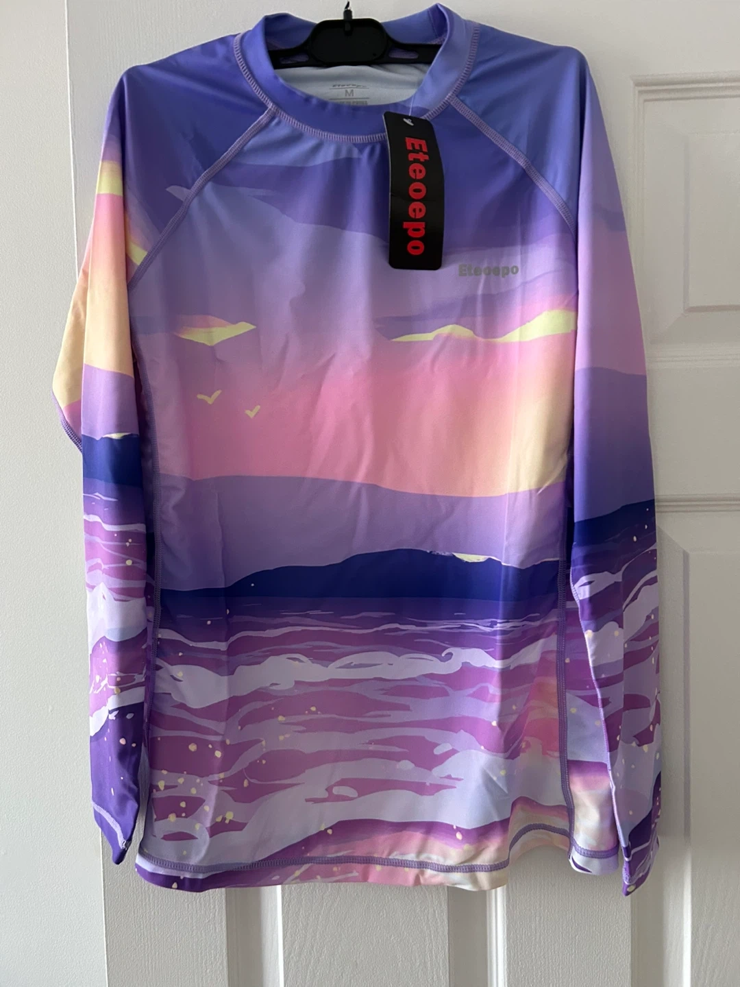 This Eteoepo new rash guard shirt is a size medium. It's made with a fabric that protects your skin. Flatlock seams and a tagless collar reduce chafing.