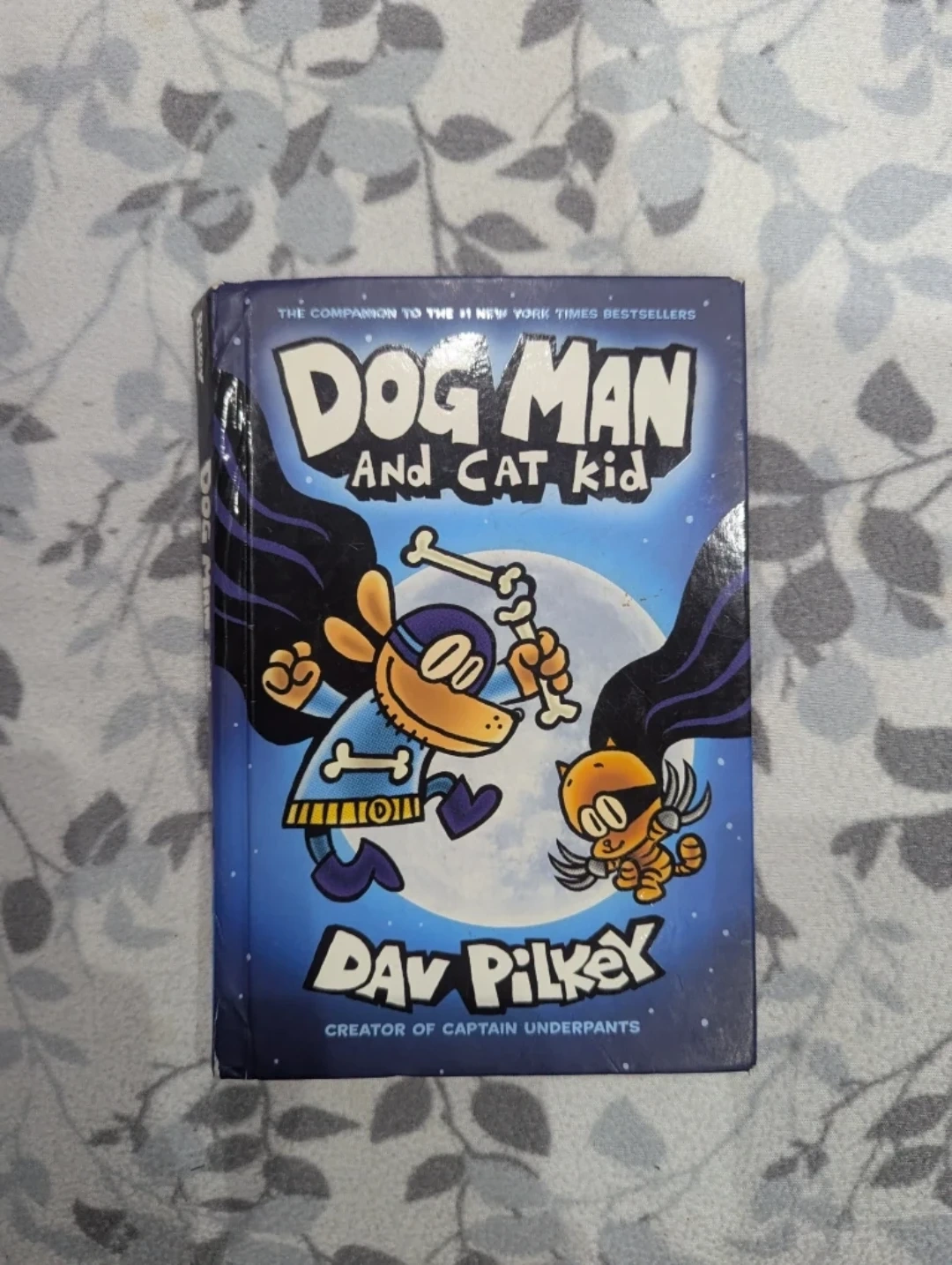 This is the book 'Dog Man and Cat Kid' by Dav Pilkey. It's a companion to the New York Times Bestsellers. It's written by the creator of Captain Underpants. This book would be great for young readers who enjoy humour and graphic novels. Not the best condition because the spine is a little bit loose