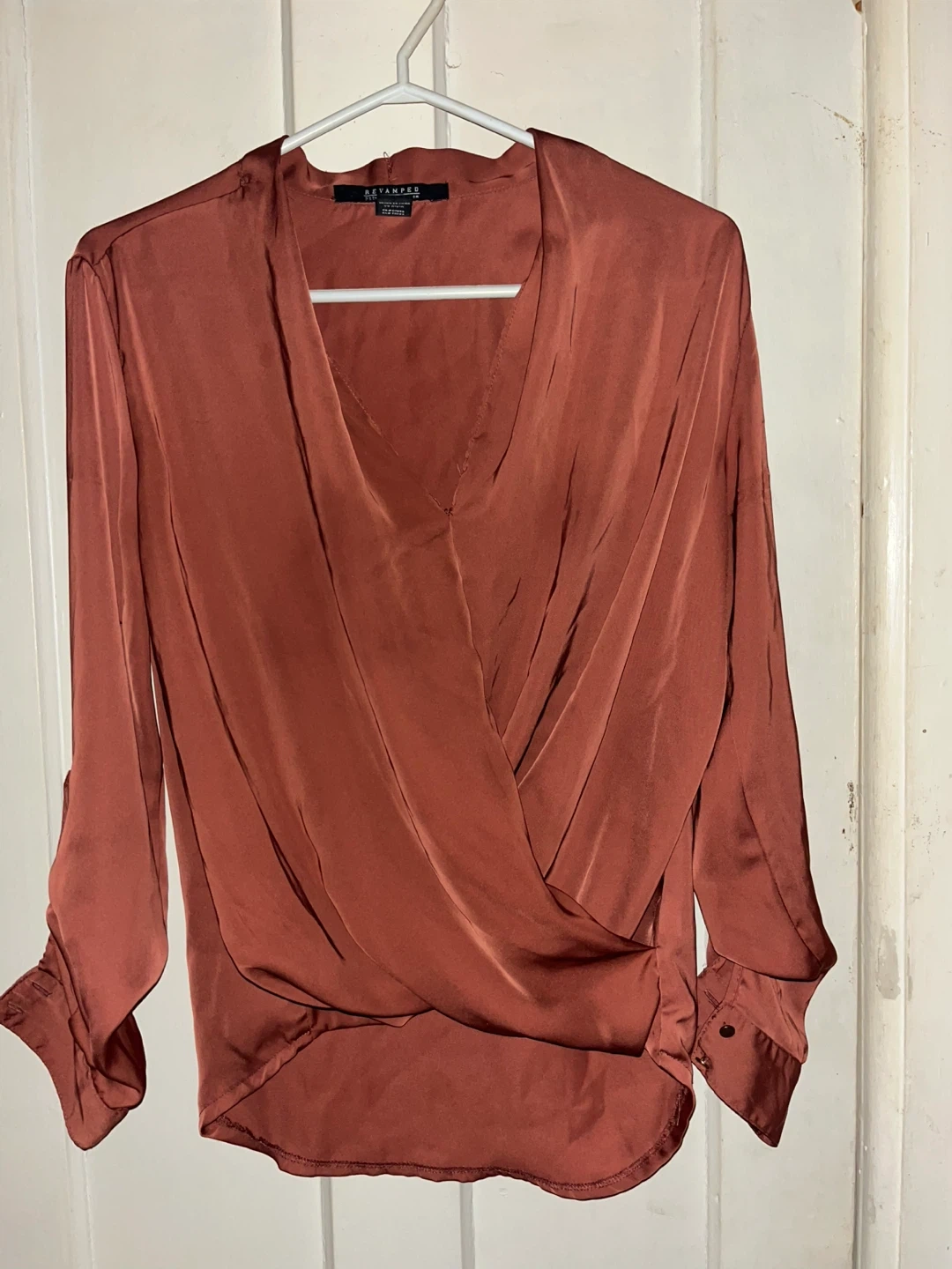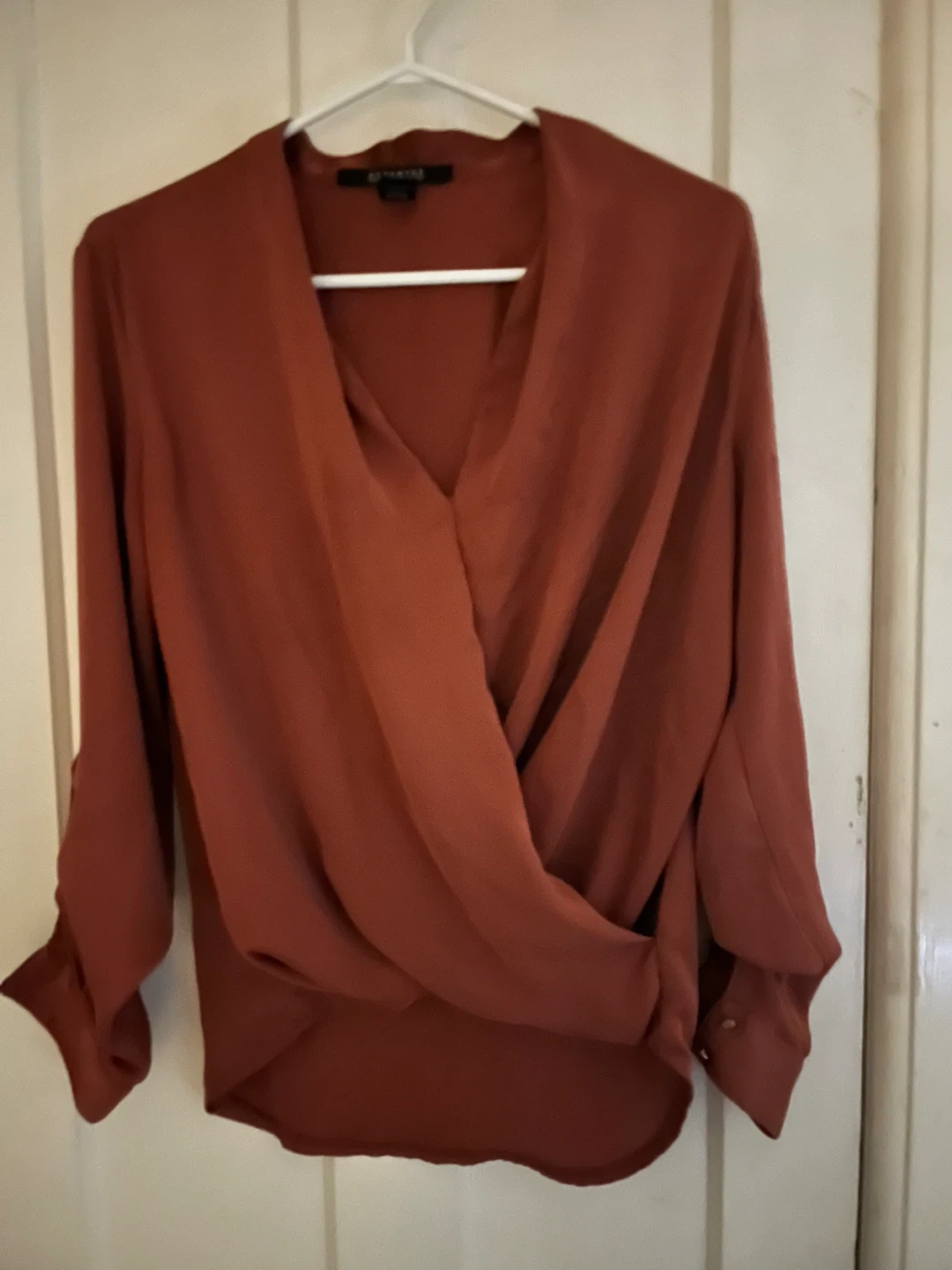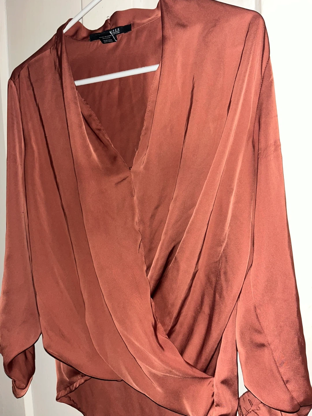This ASOS satin wrap blouse comes in a beautiful rust colour. It's designed with a deep V-neck and a flattering crossover front. Perfect for dressing up or down, it'll look fab with jeans or tailored trousers!