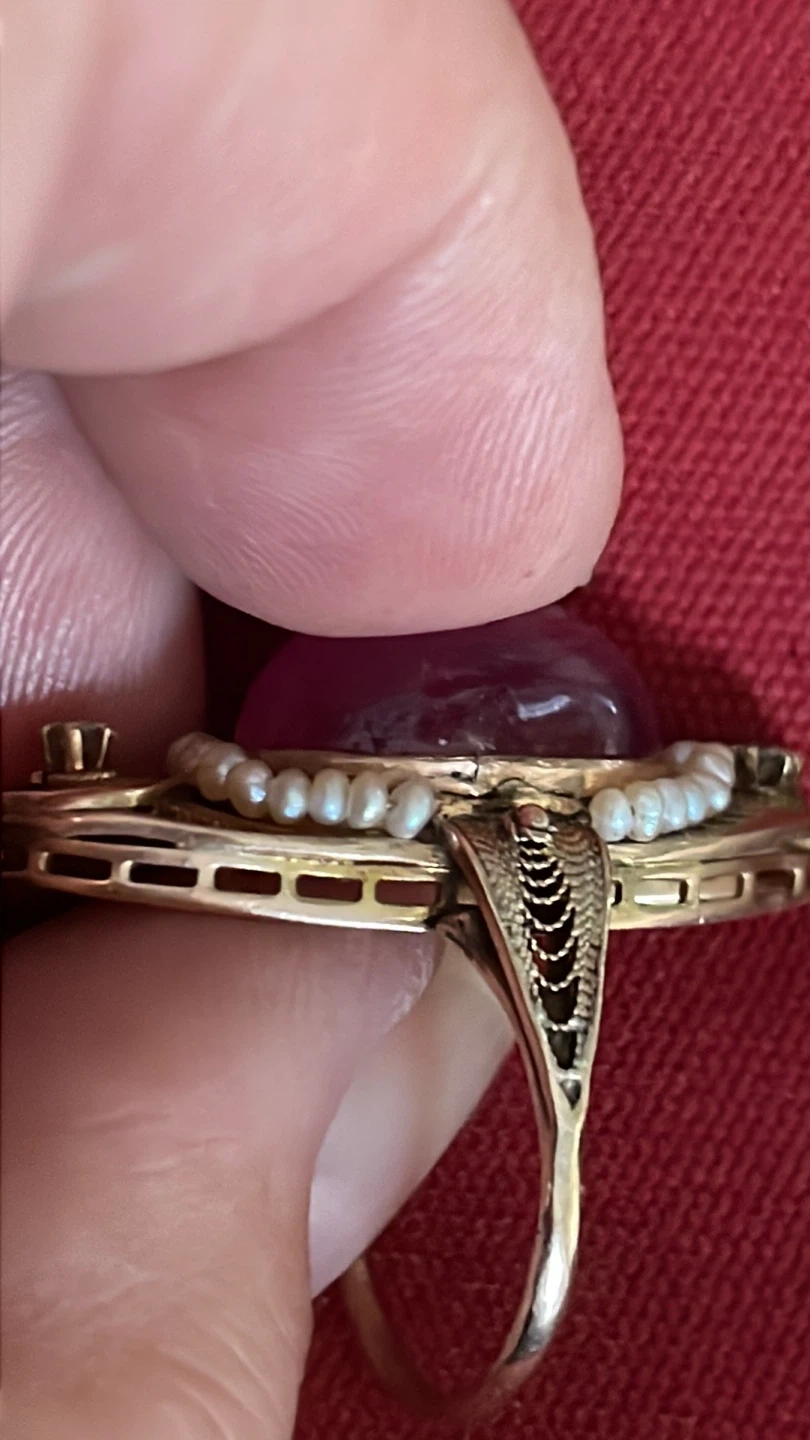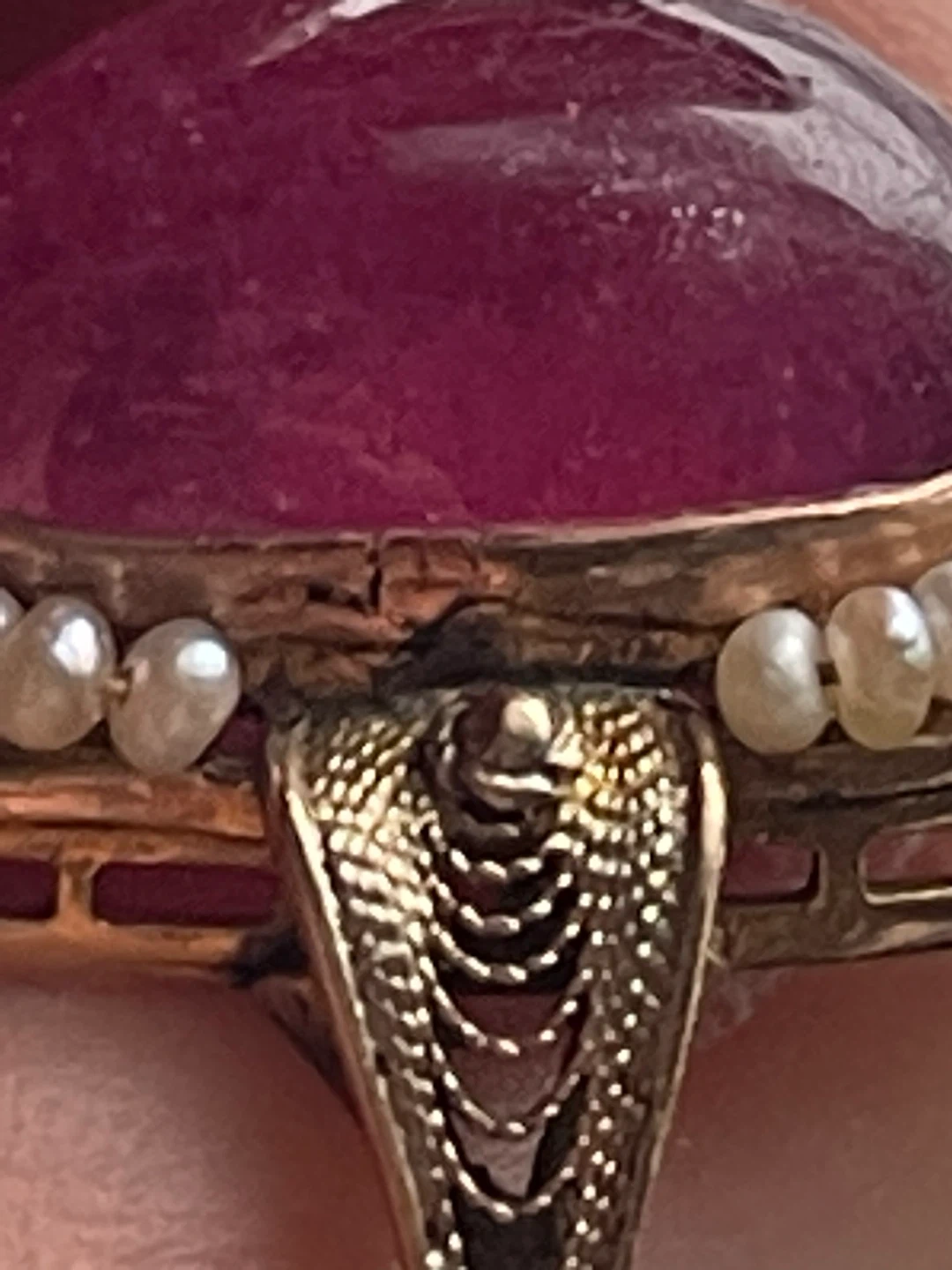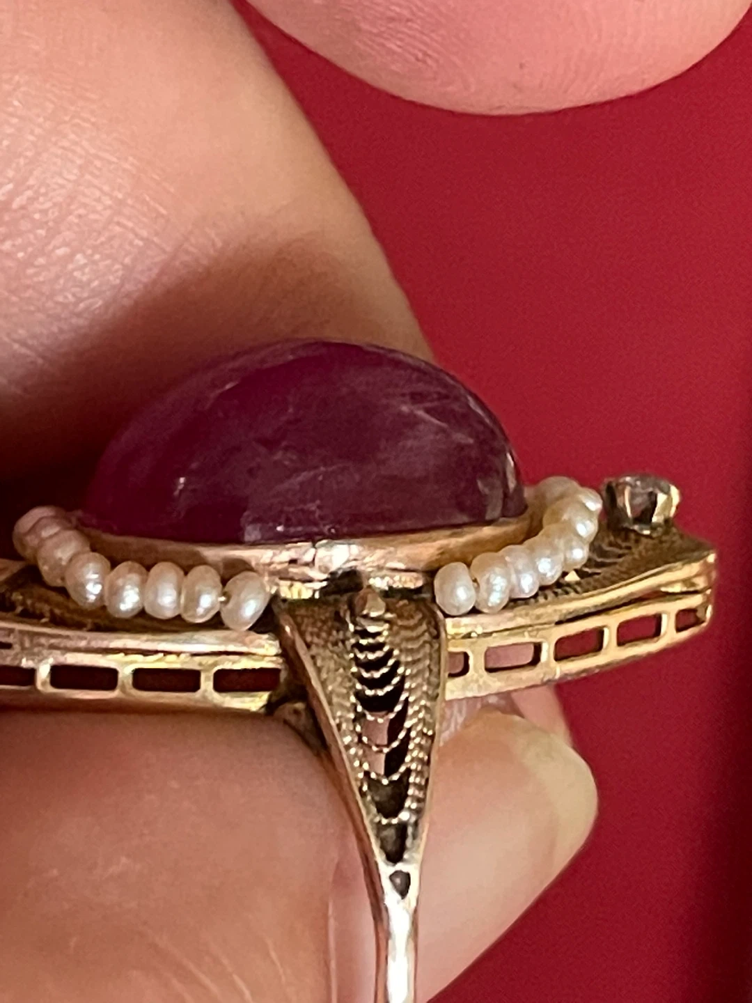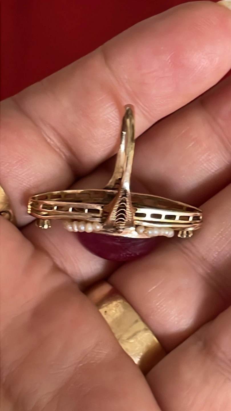 Stunning 10k vintage ring featuring a large pink cabochon ruby, accented with seed pearls , diamonds and delicate gold filigree. It's a beautiful statement piece for any occasion.