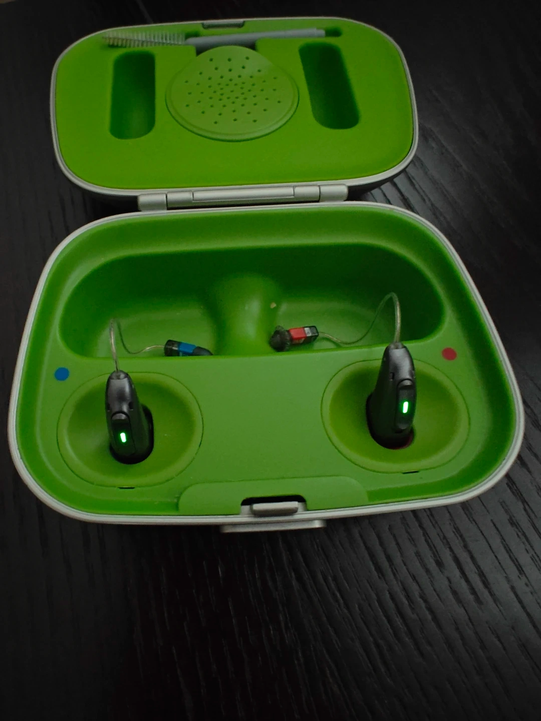 Pair of Phonak hearing aids with their charging case. Includes a cleaning brush. These are rechargeable units.
