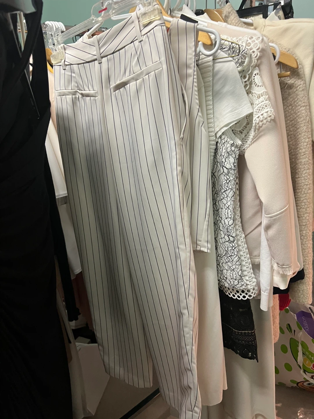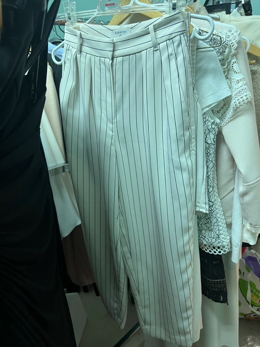 These Babaton trousers feature a classic pinstripe pattern. They are a size 00. These pants offer a professional and chic look. I have a matching top for $50.