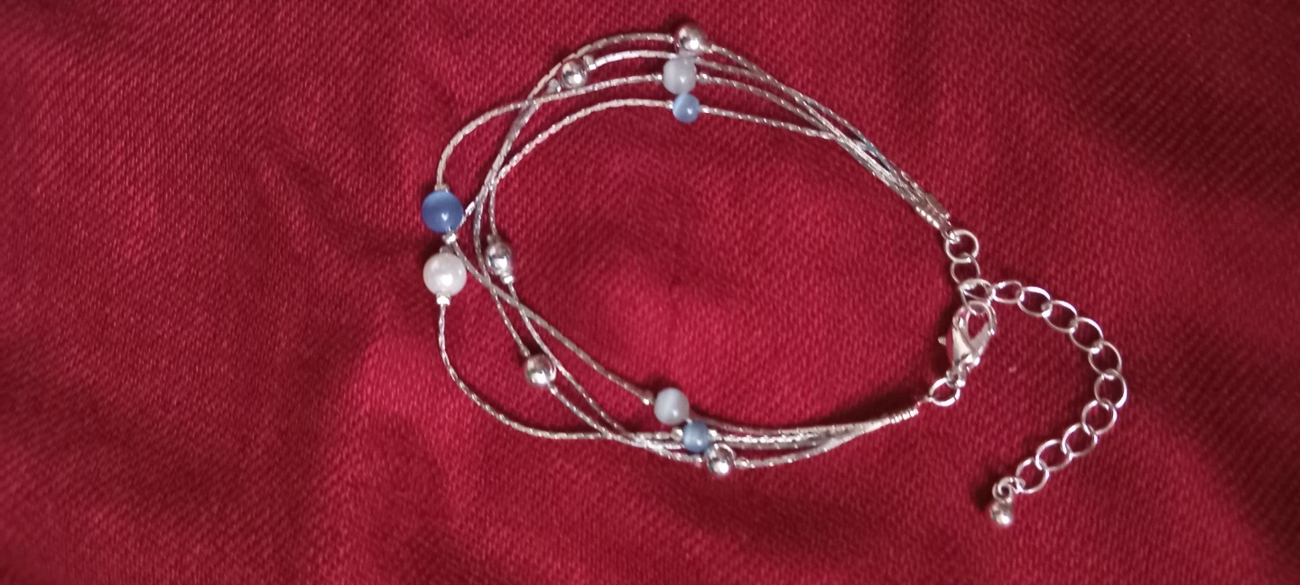 A delicate multi-strand bracelet featuring silver-tone chains and a mix of small white, blue, and clear beads. It has a lobster clasp and an extender chain for adjustable sizing. This bracelet's dainty design makes it a nice addition for everyday wear or special occasions.
