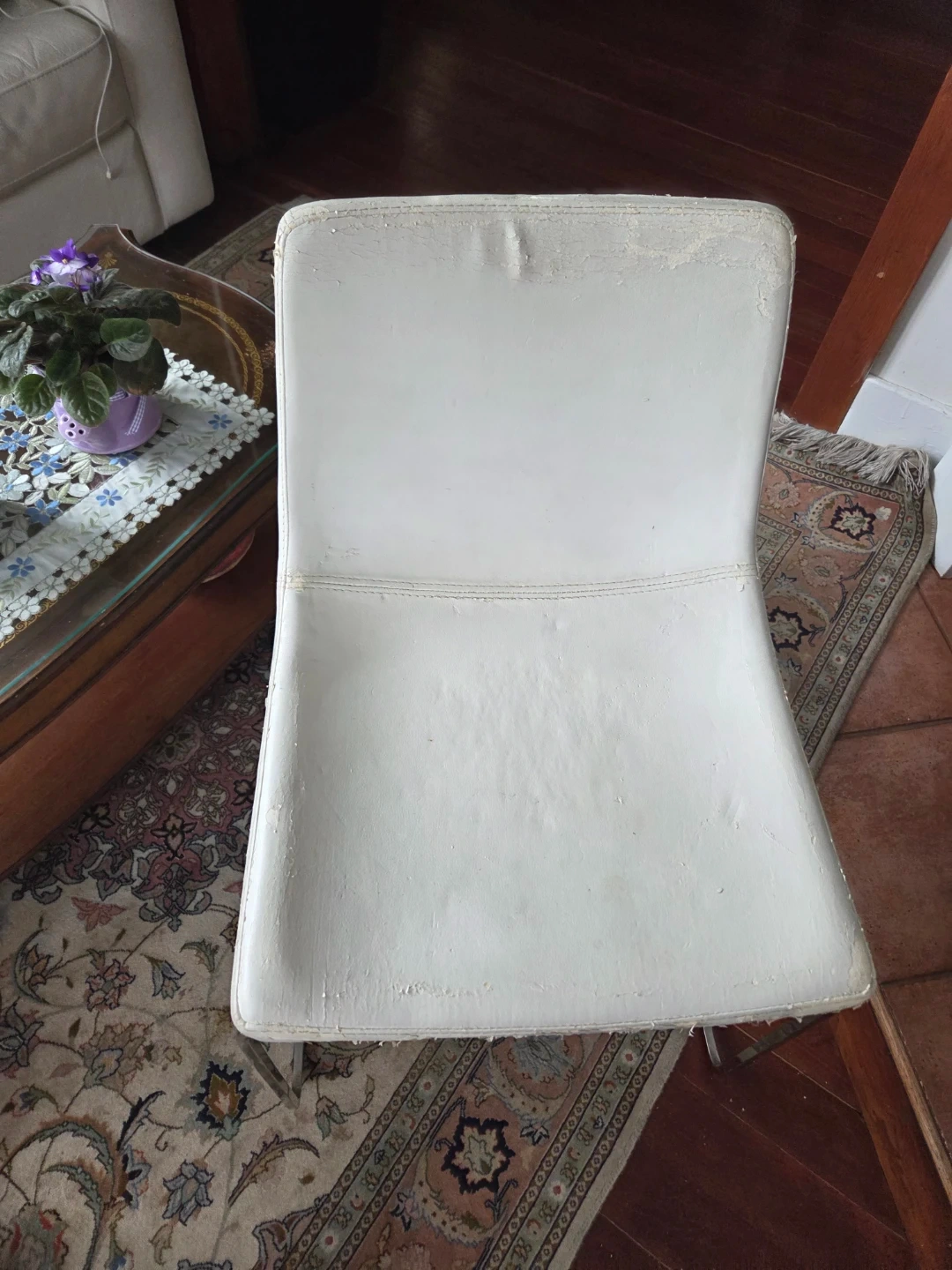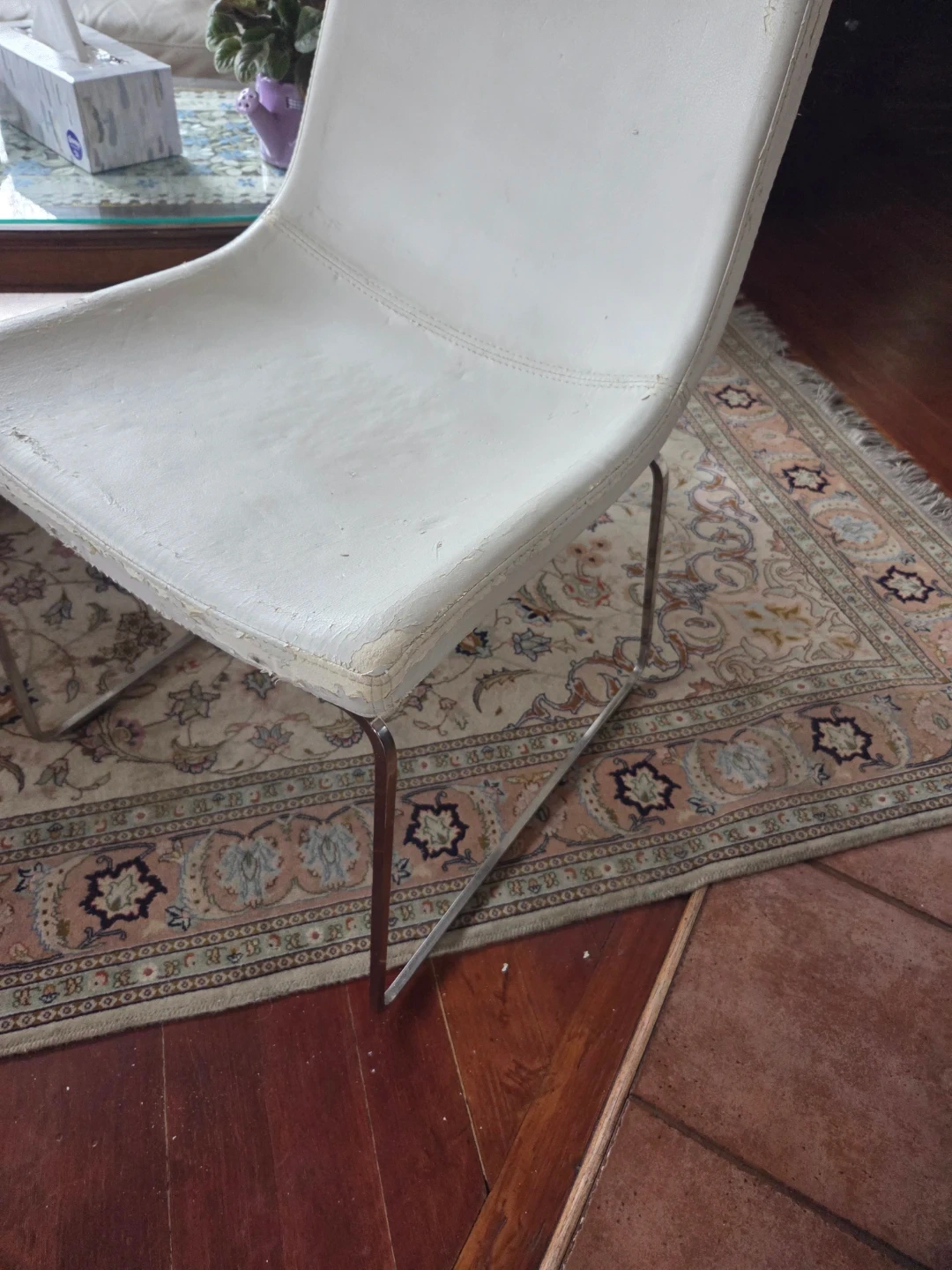 This white chair has a curved seat and back with metal legs. It's upholstered in a white faux leather material that shows some wear. The frame is sturdy and suitable for dining or accent seating.