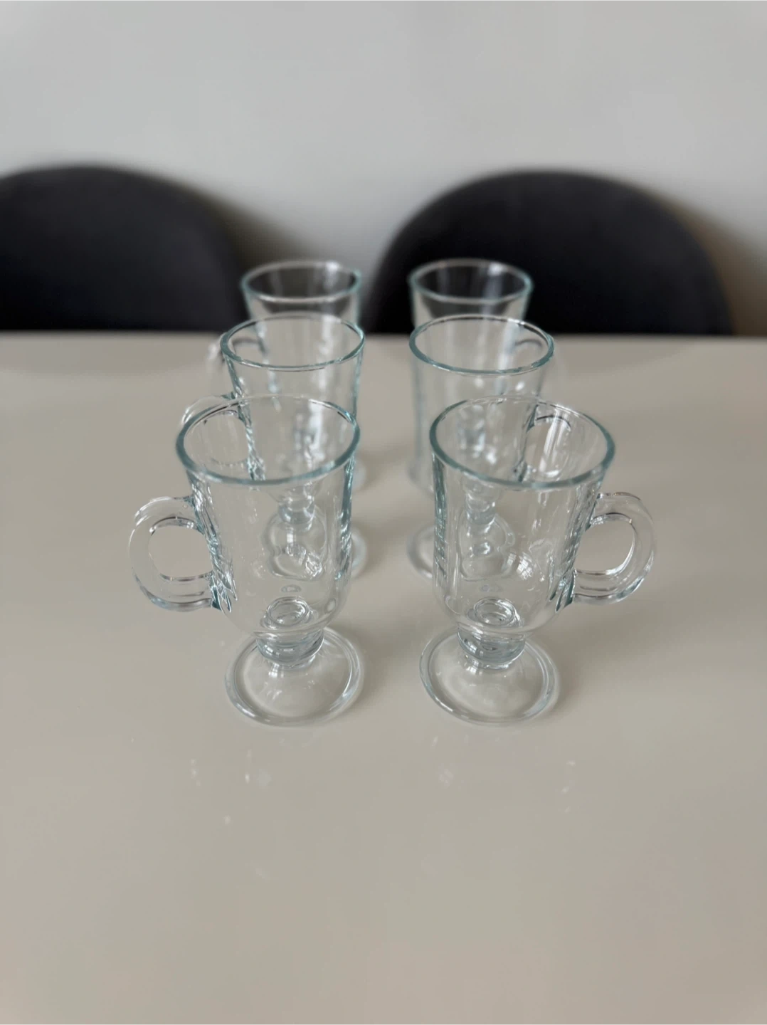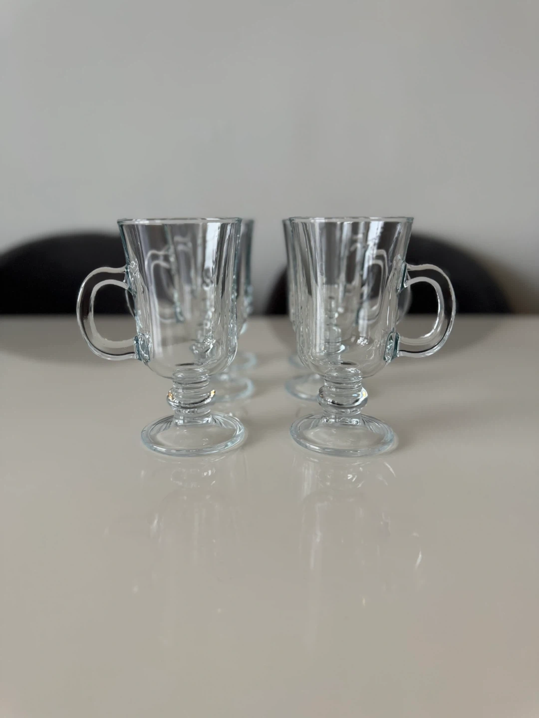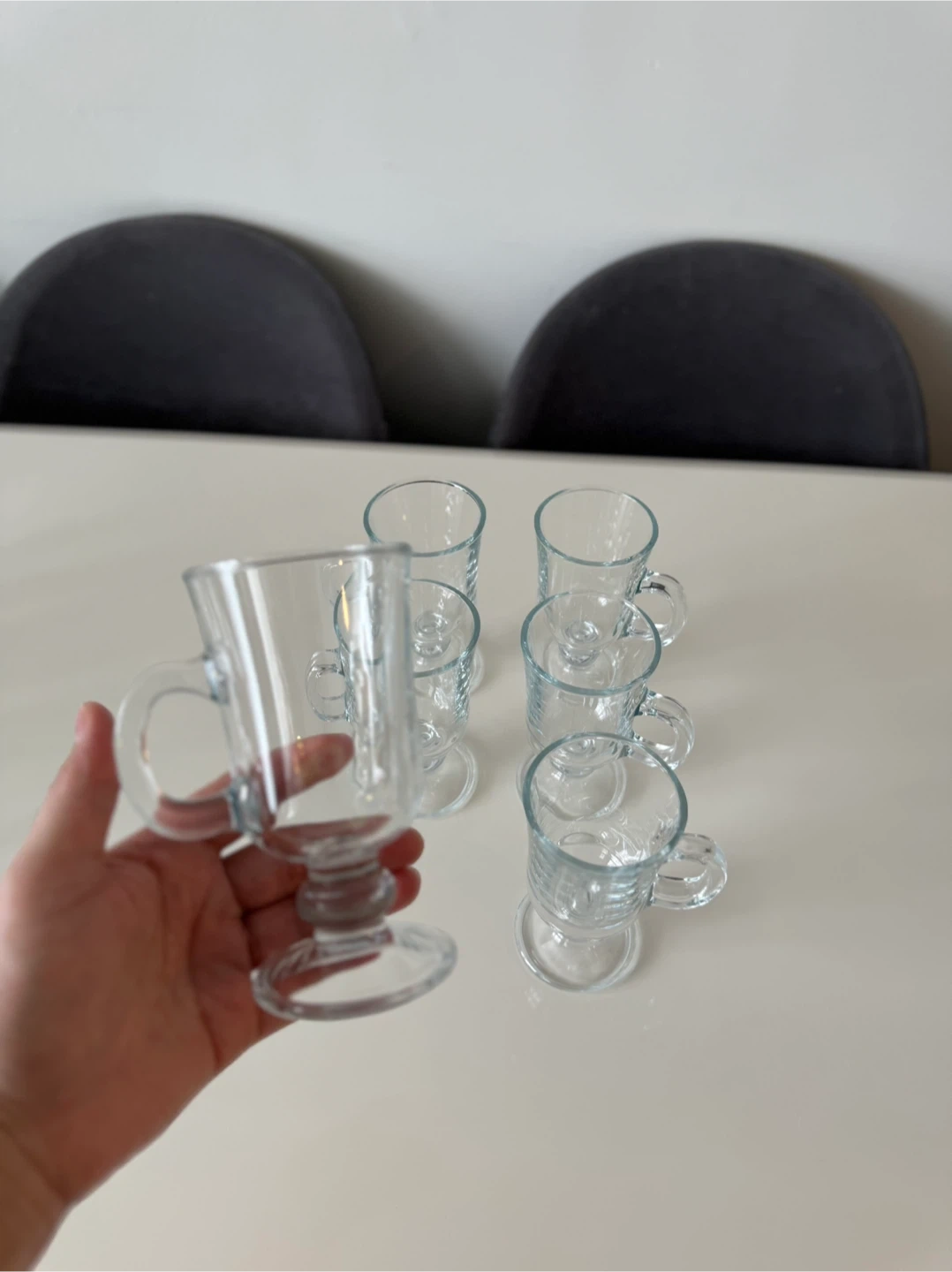 Set of six clear glass footed mugs. Features a handle and ribbed design on the bowl and base. Ideal for hot beverages like coffee or tea.