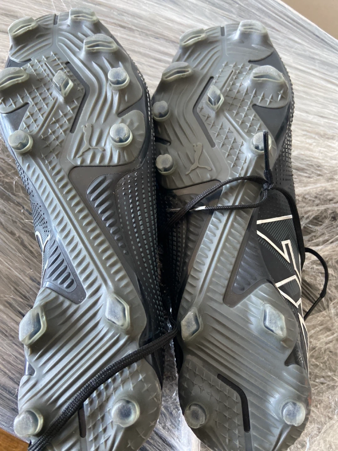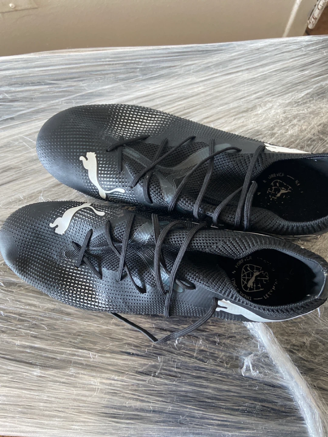 These Puma soccer cleats are black and size 10 US. They're made in Indonesia and feature a synthetic material. These cleats are suitable for playing soccer on firm ground.