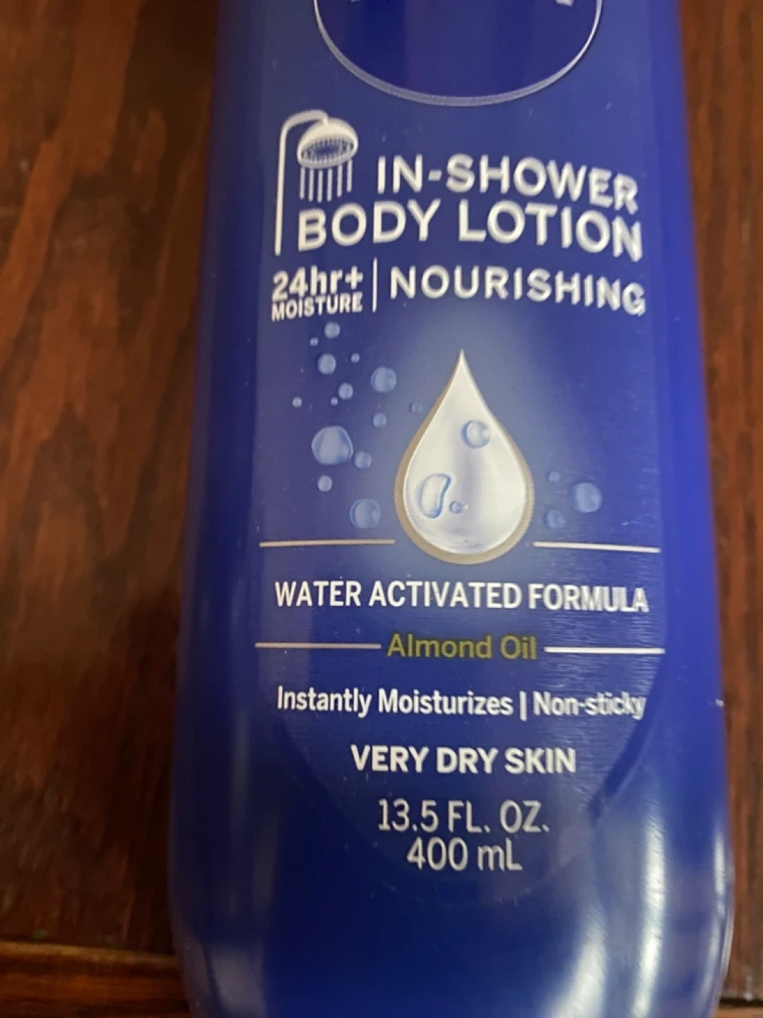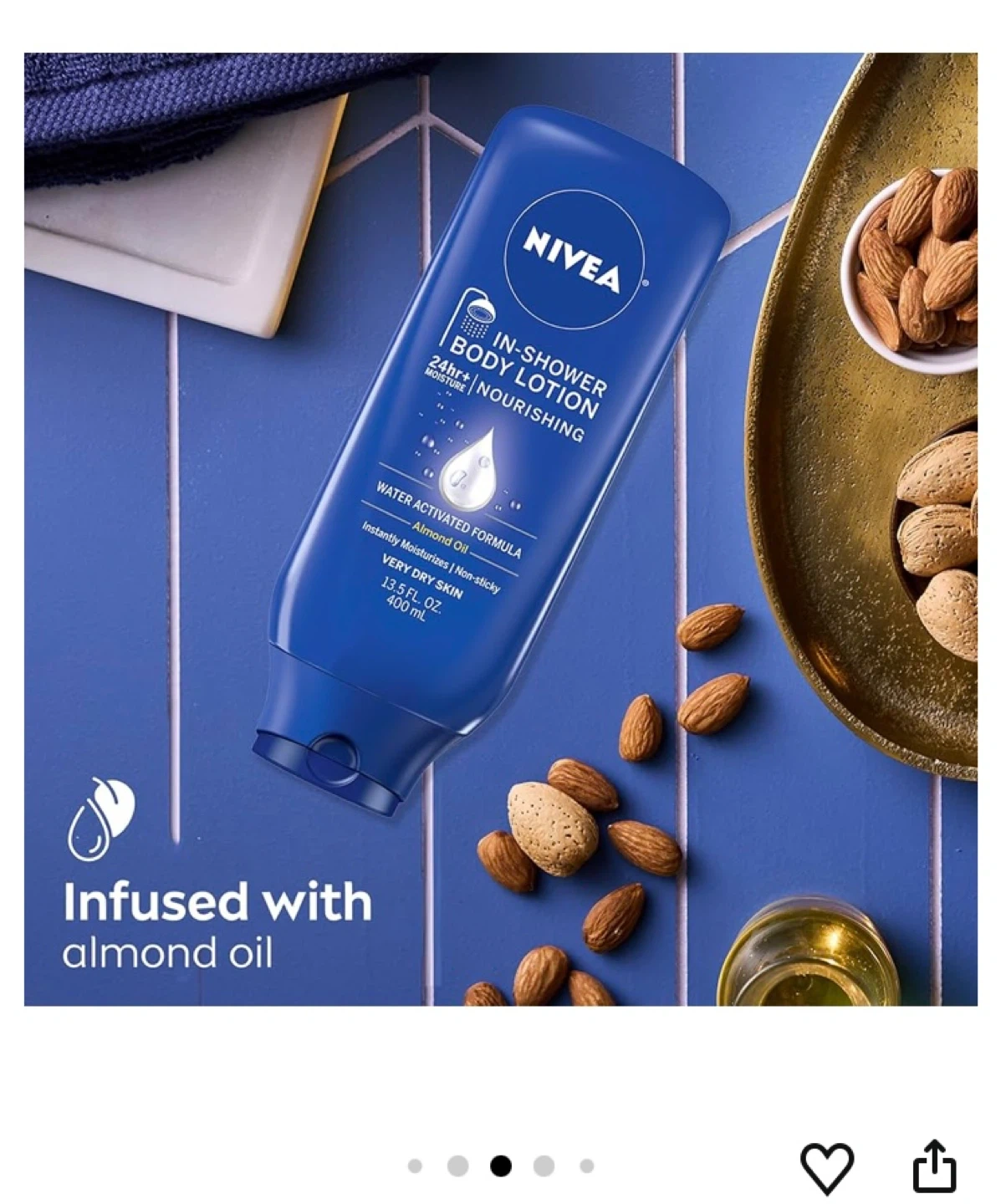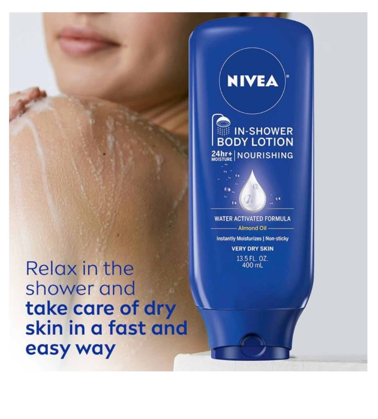 NIVEA In-Shower Nourishing Body Lotion with almond oil. It's a water-activated formula for very dry skin. Instantly moisturizes with no sticky feel. Provides 24hr+ nourishing moisture.