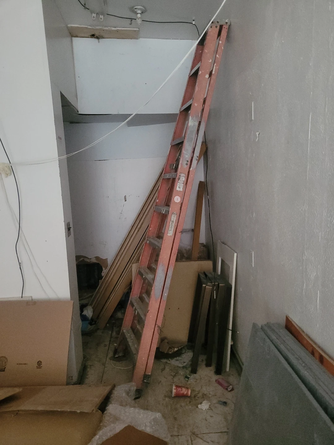 This is an orange ladder. It's a sturdy tool for reaching high places. Material appears to be fiberglass. It's a great ladder for home or professional use!