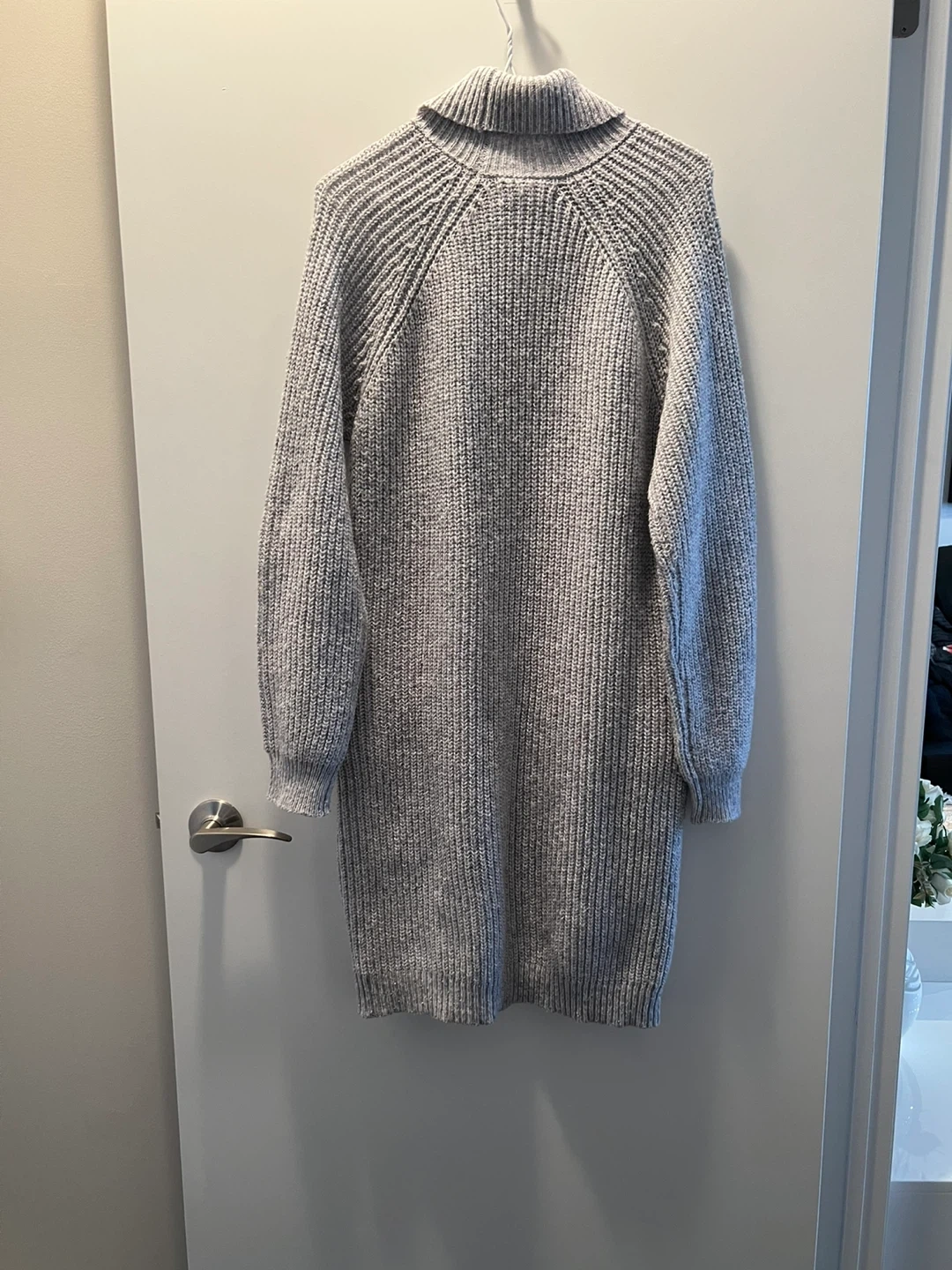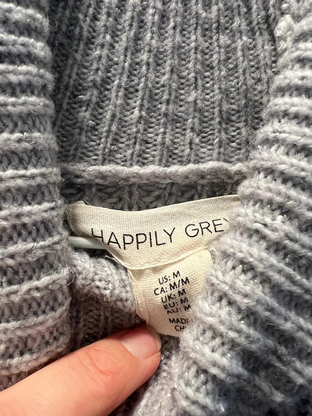 This is a women's turtleneck sweater dress from Happily Grey. It's a heather grey colour and a size medium. Ribbed knit construction.