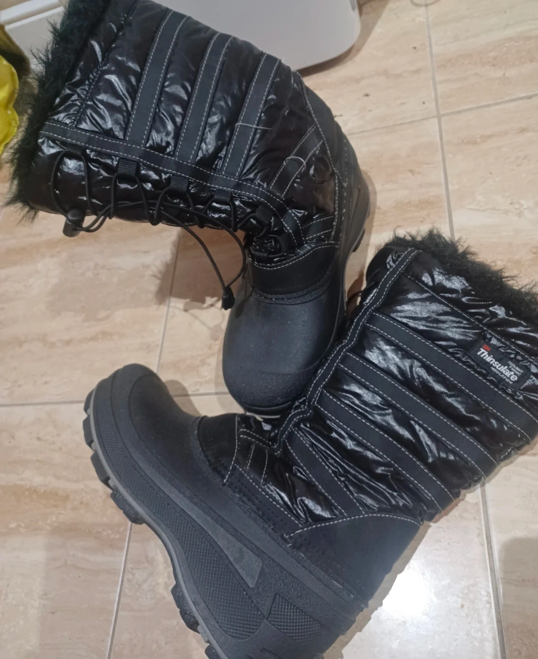 These black winter boots are insulated with Thinsulate for warmth. They feature a shiny quilted upper and a furry trim around the top. The boots have a lace-up closure with a toggle for a snug fit. Perfect for keeping your feet toasty in cold weather! Size 9