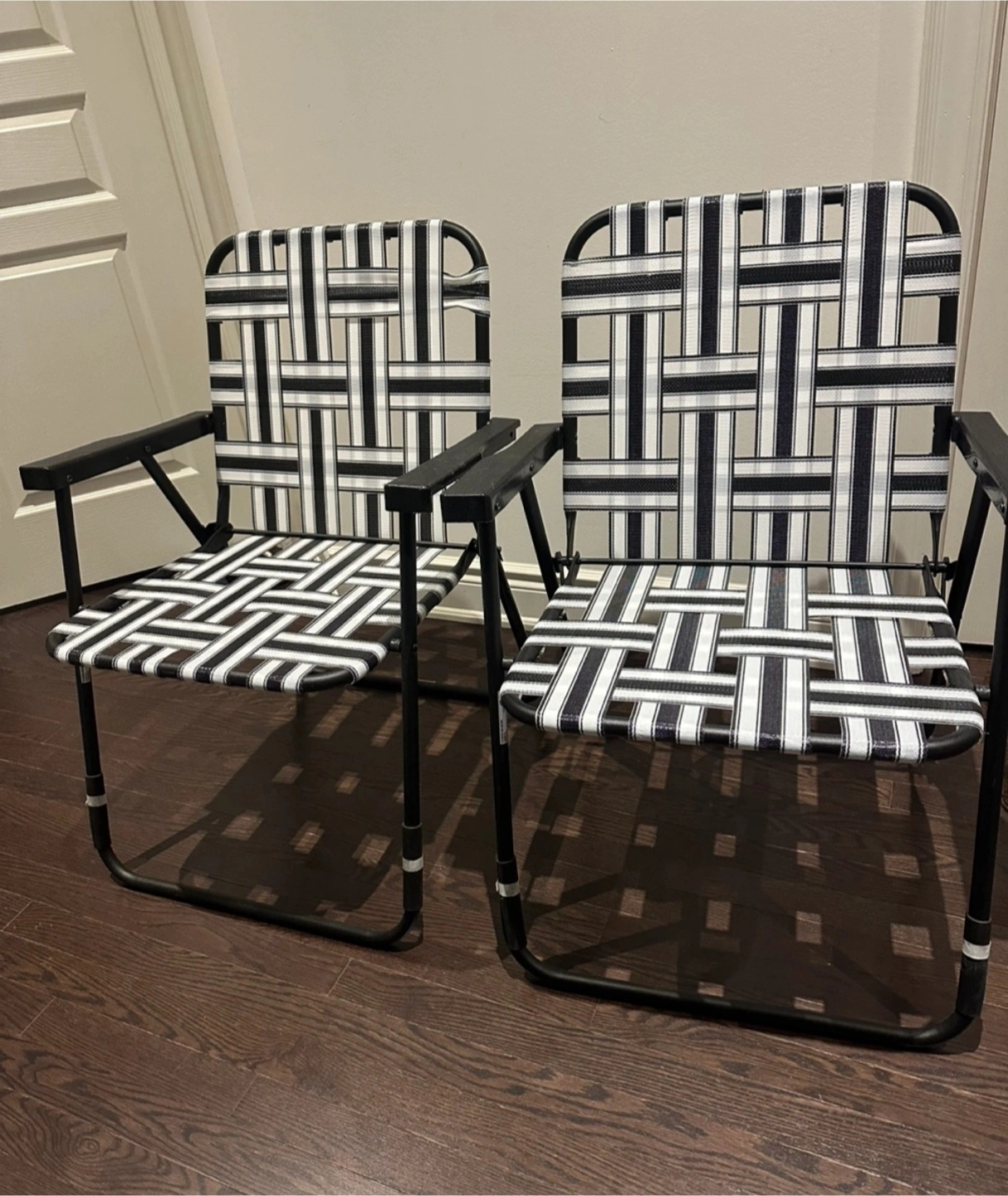Two folding camp chairs with a black and white striped woven seat and back. They have black metal frames and armrests. These chairs are lightweight and portable. Great for camping trips or backyard gatherings!