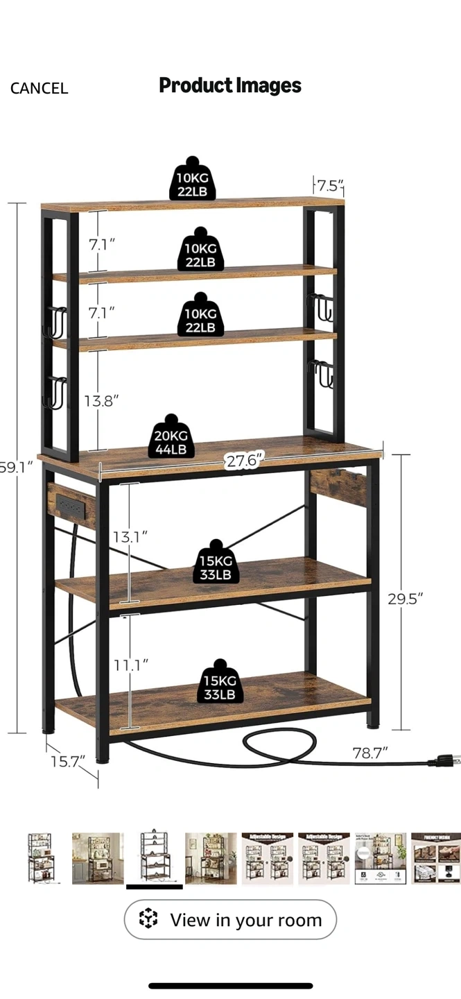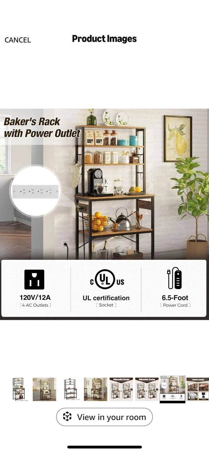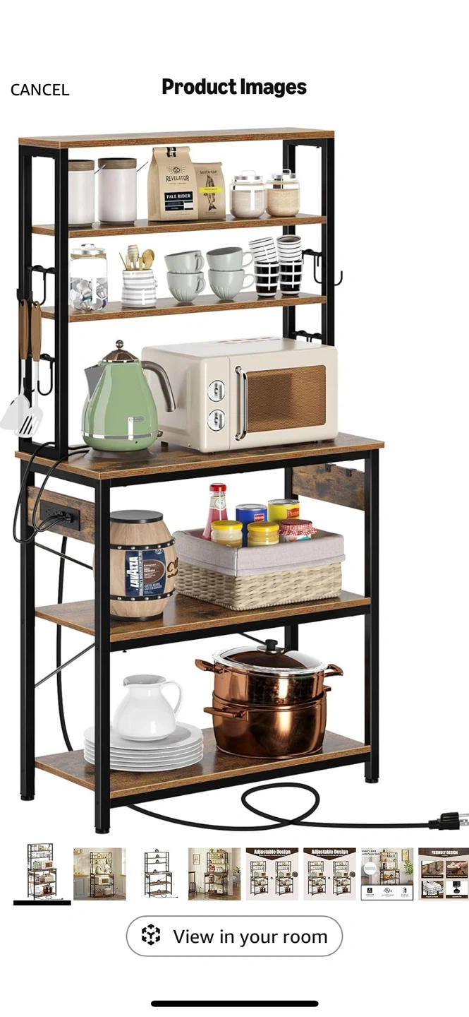 I'm selling a Rolanstar Baker's Rack with Power Outlet. It features a microwave oven stand with 10 hooks, a stable coffee bar table, and a 6-tier kitchen storage shelf rack with a hutch in rustic brown. It also has 4 AC outlets and a 6.5-foot power cord. The surface is waterproof and easy to clean, and it has adjustable feet