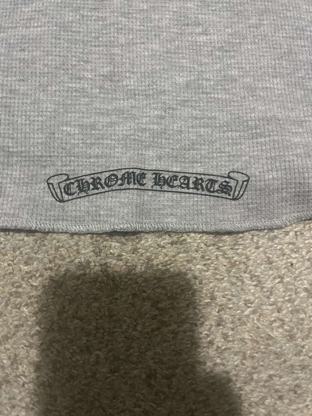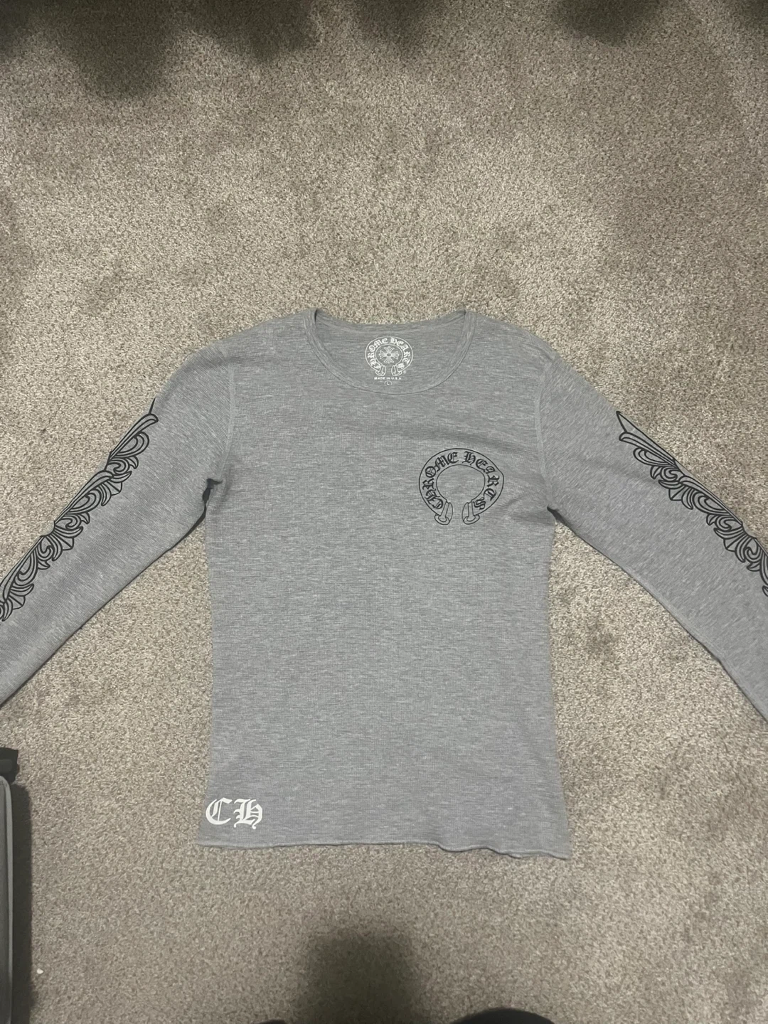 This is a grey thermal long sleeve shirt from Chrome Hearts. It's made in the U.S.A. and features their signature logo on the chest and sleeves. This shirt is a size large. It's a waffle knit fabric.
