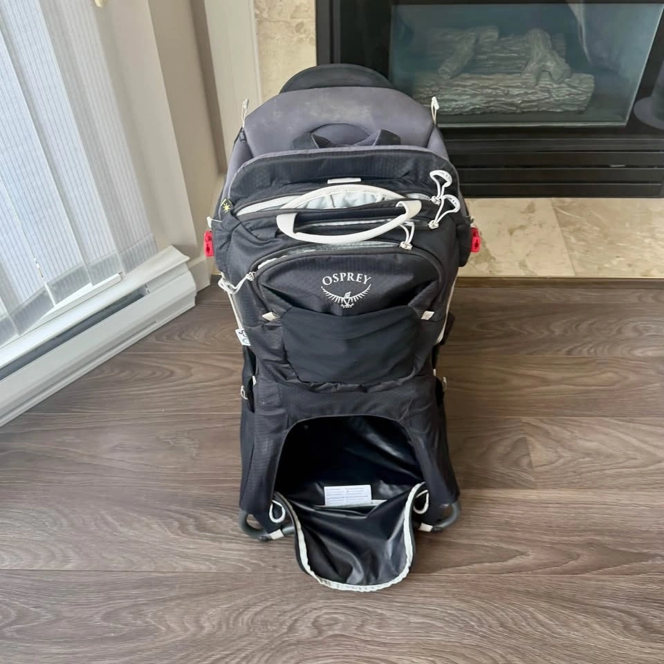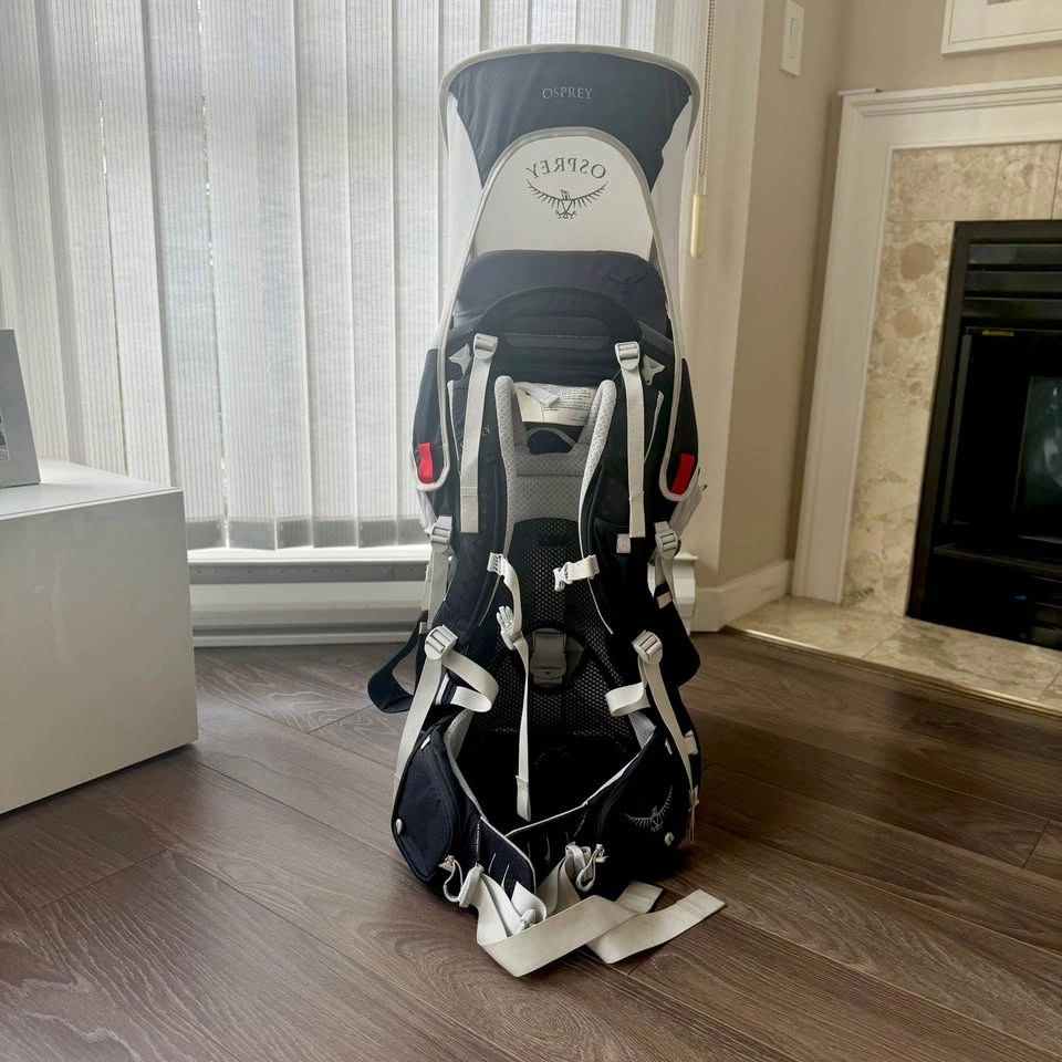 The Osprey Poco Plus is a top-tier hiking child carrier designed for children from 6 months to 4 years (up to 48.5 lbs total weight). Key features include a built-in UPF 50+ sunshade, 26L of storage, a stable aluminum frame, and an adjustable, ventilated back panel for comfort. It includes a secure "halo" harness, stirrups, and a drool pad. Comes with carry case. No returns. From smoke pet free home. eTransfer ok.